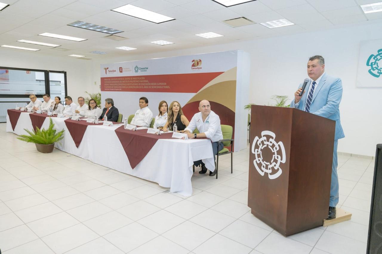 Ciudad Victoria, Tamaulipas.– Para transformar a Tamaulipas en un referente nacional e internacional en la producción de dispositivos semiconductores discretos, a través de la formación de profesionistas altamente capacitados en este sector tecnológico, se celebró la firma de convenio de colaboración entre el Gobierno del Estado, a través de la Secretaría de Educación de Tamaulipas (SET), con el Centro de Investigación y de Estudios Avanzados del Instituto Politécnico Nacional (CINVESTAV).