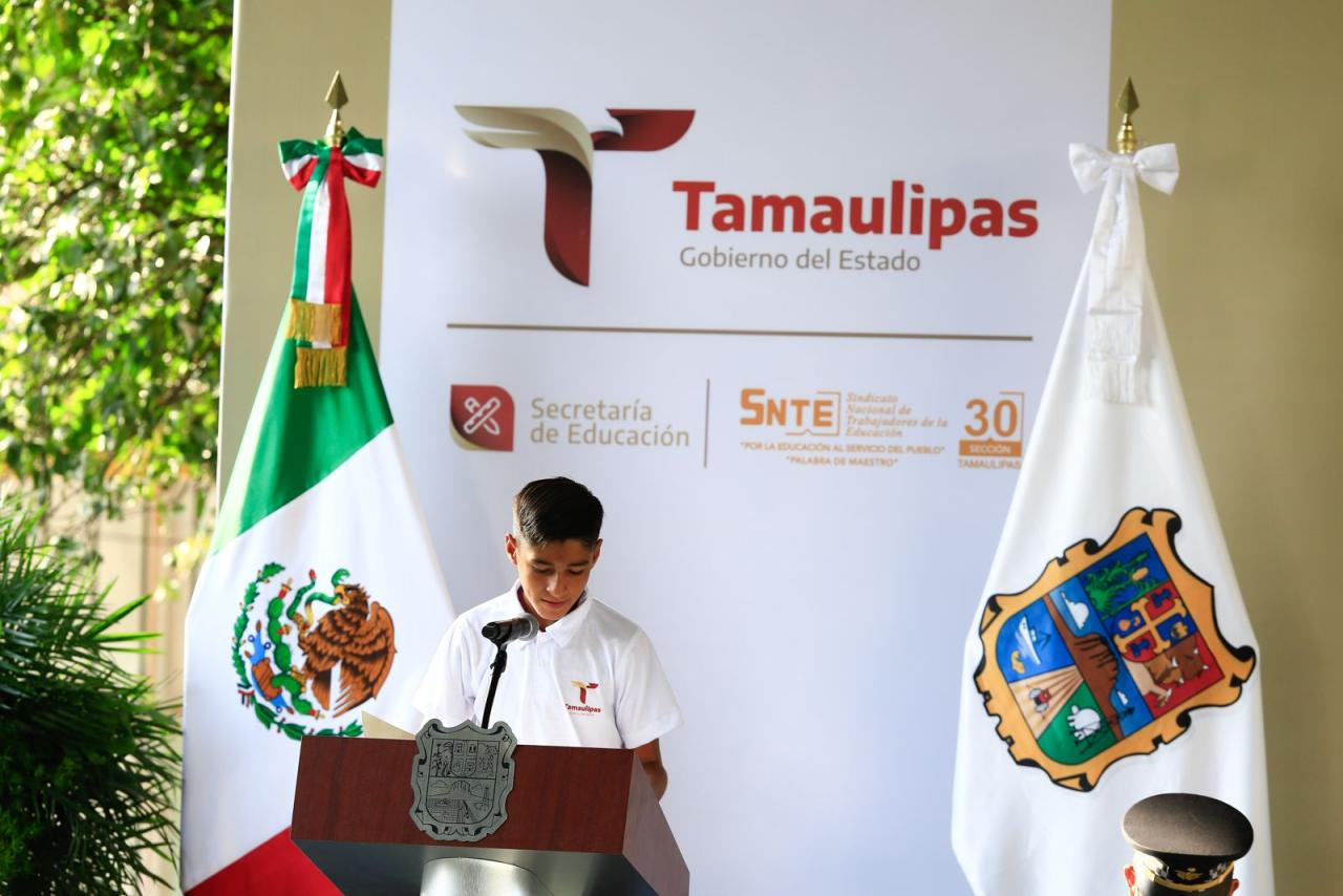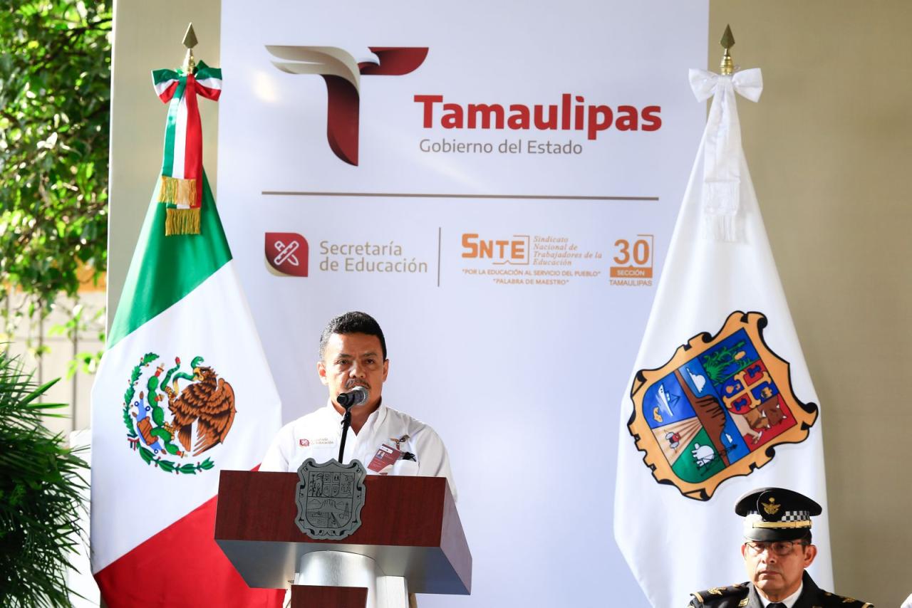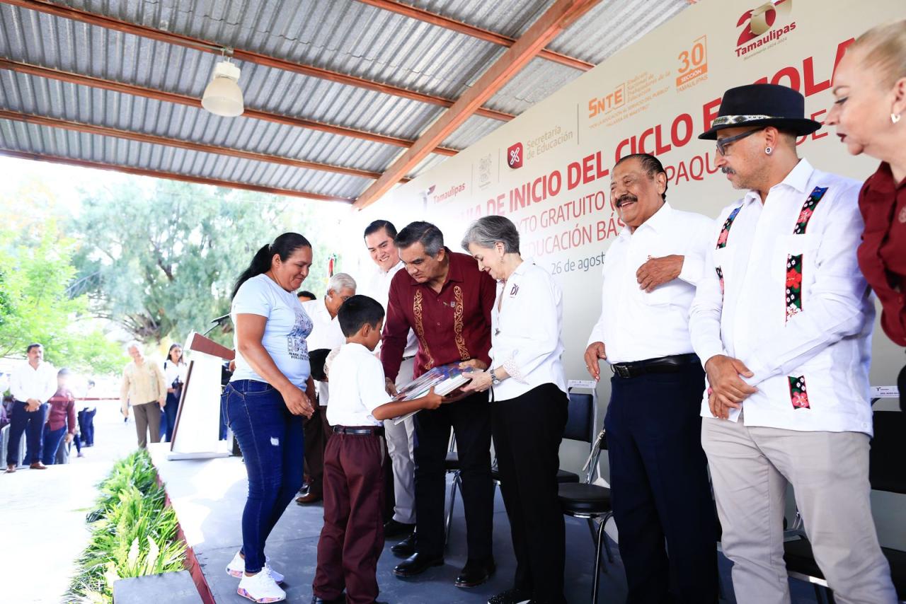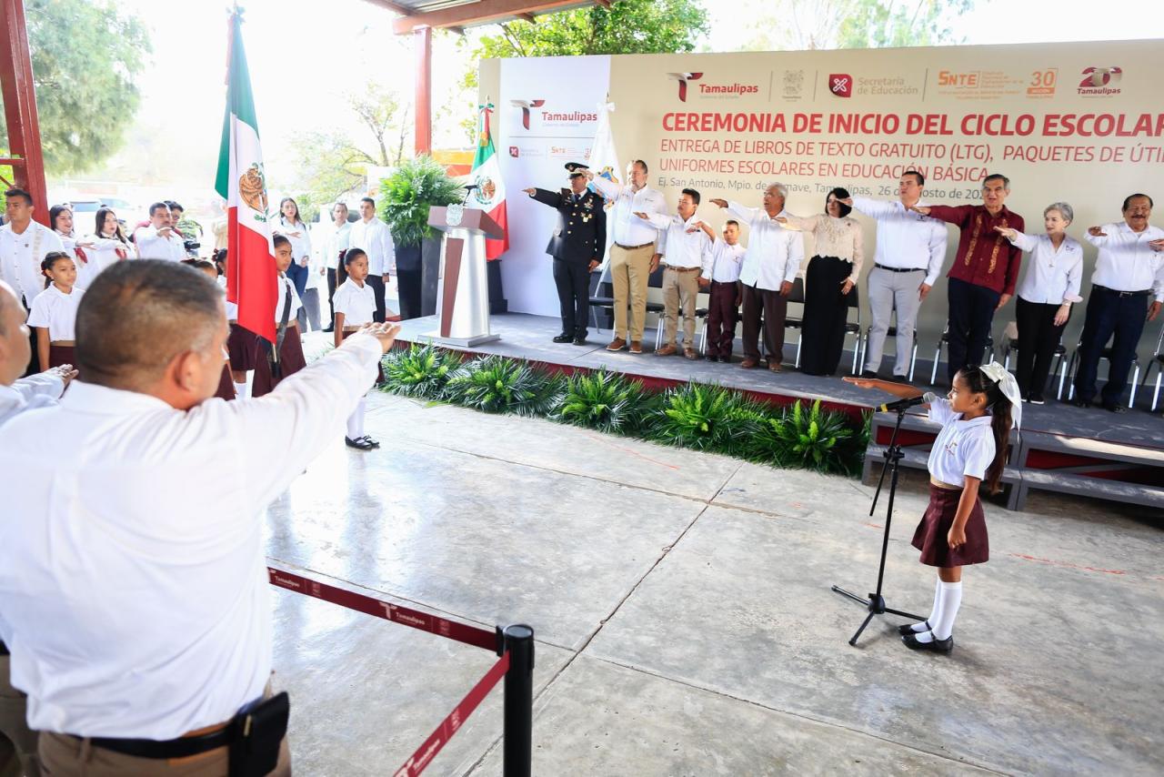 Durante la ceremonia cívica en la Escuela Primaria Francisco Zarco, del ejido San Antonio, municipio de Jaumave, y acompañado por la presidenta del DIF Tamaulipas, doctora María de Villarreal; el secretario general de la Sección 30 del SNTE, Arnulfo Rodríguez Treviño, y Rodrigo Castillo Aguilar, representante de la secretaria de Educación federal Leticia Ramírez Amaya, el gobernador entregó paquetes de útiles, uniformes y libros de texto gratuitos, ahí reiteró que su gobierno estará atento para mejorar las instalaciones educativas a través del ITIFE.