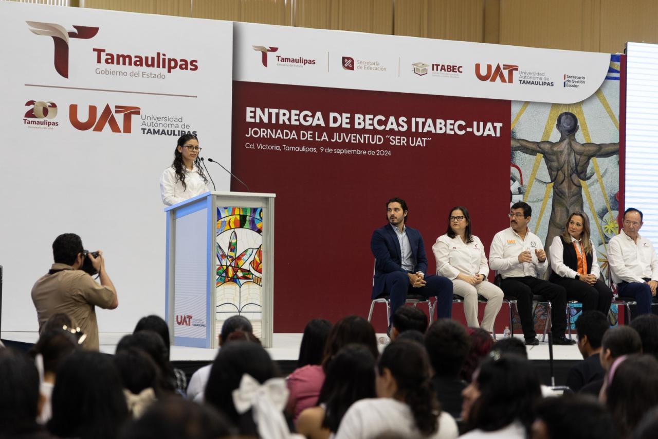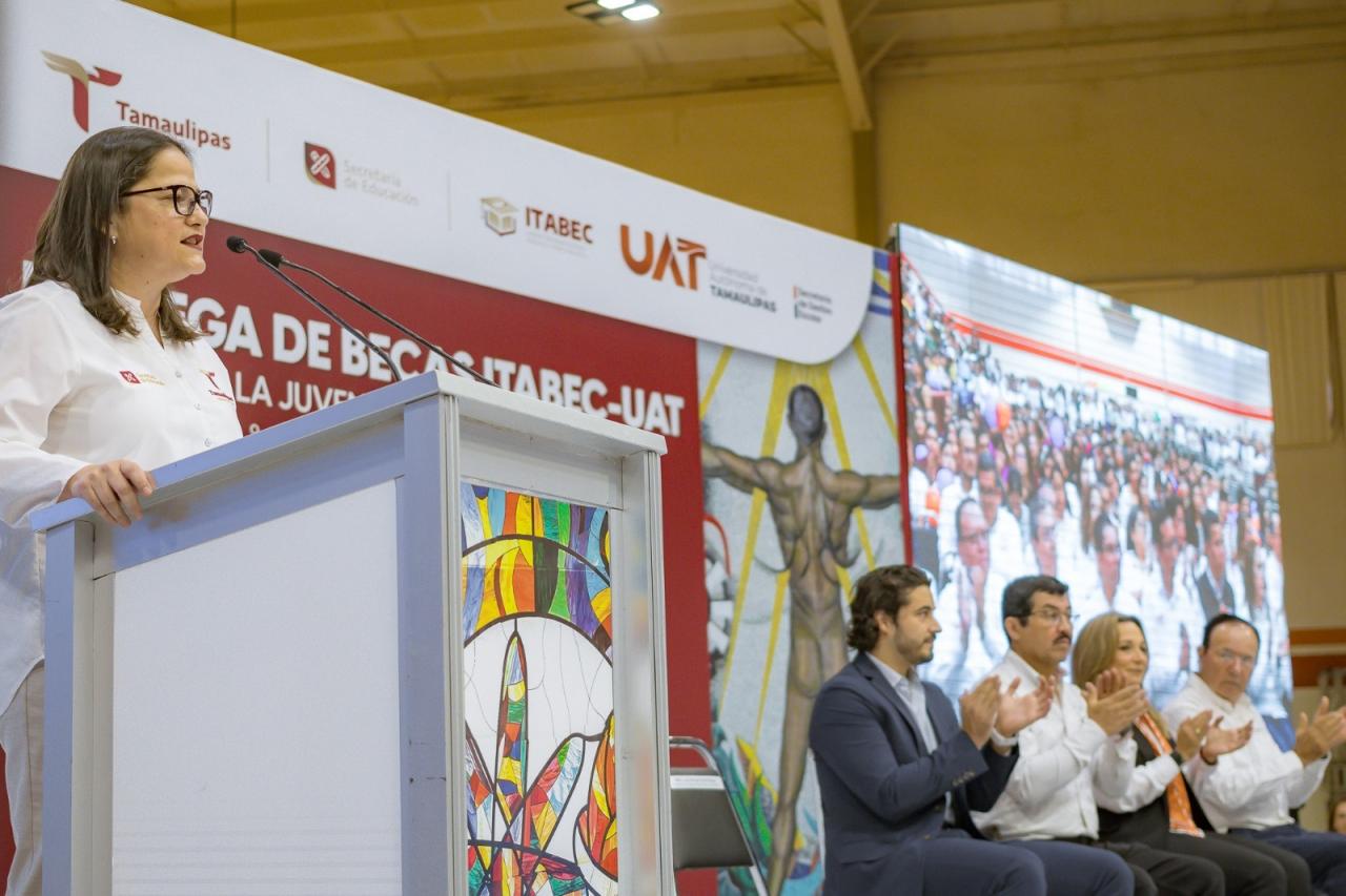 En representación del gobernador Américo Villarreal Anaya, la secretaria de Educación, Lucía Aimé Castillo Pastor, hizo la entrega simbólica de este programa de becas, que corresponde al periodo de enero a junio de este año, con una inversión de 18 millones 184 mil pesos.
