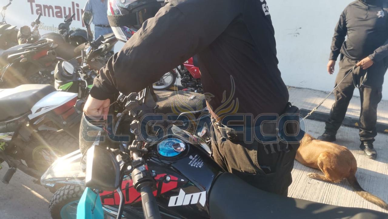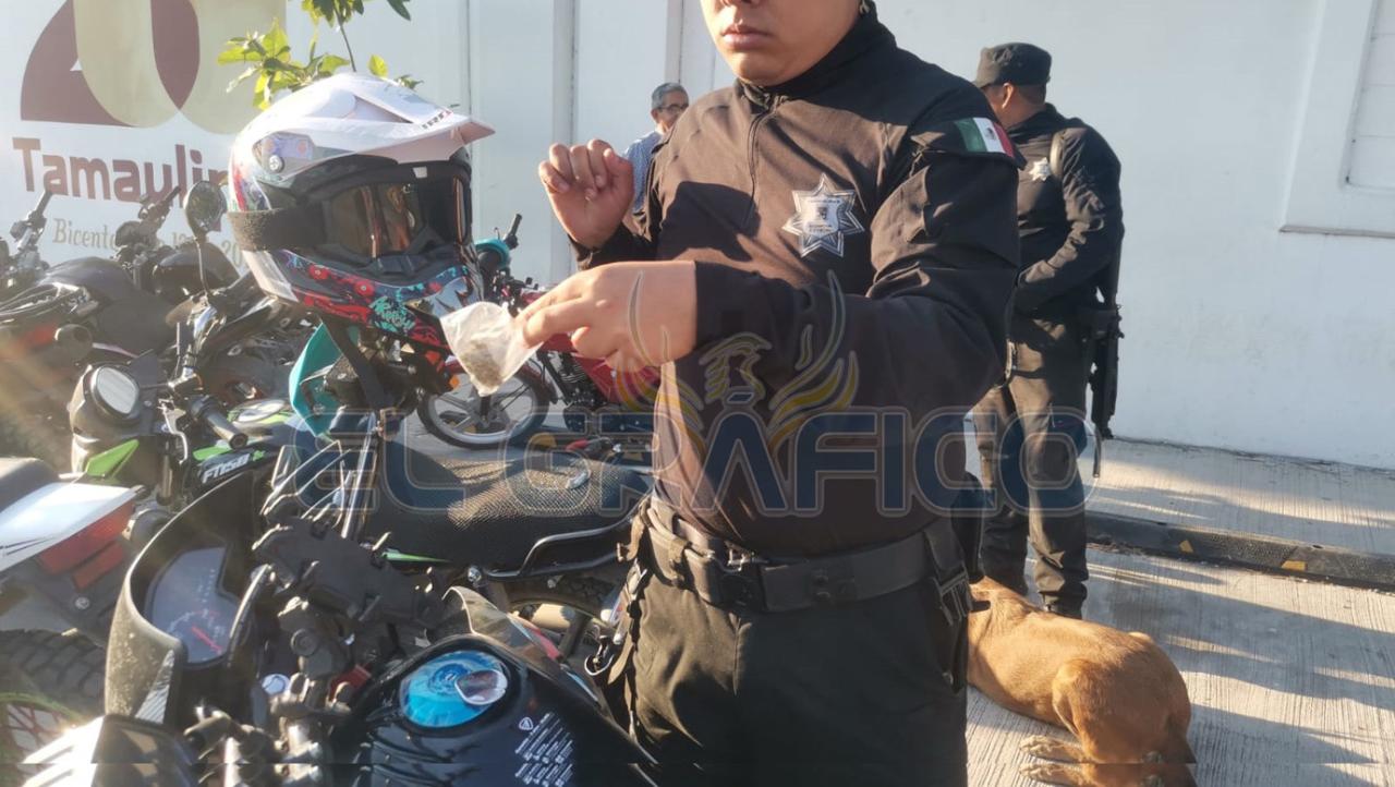 Aún después de que los estudiantes entraron a clases, al continuar con la revisión, el binomio canino detectó una bolita con una sustancia aparentemente droga escondida en una motocicleta estacionada afuera del plantel escolar de nivel bachillerato.