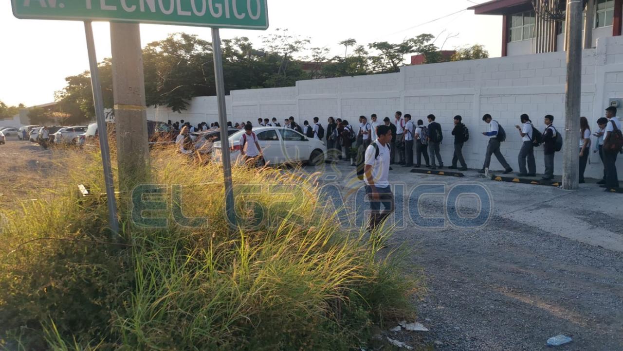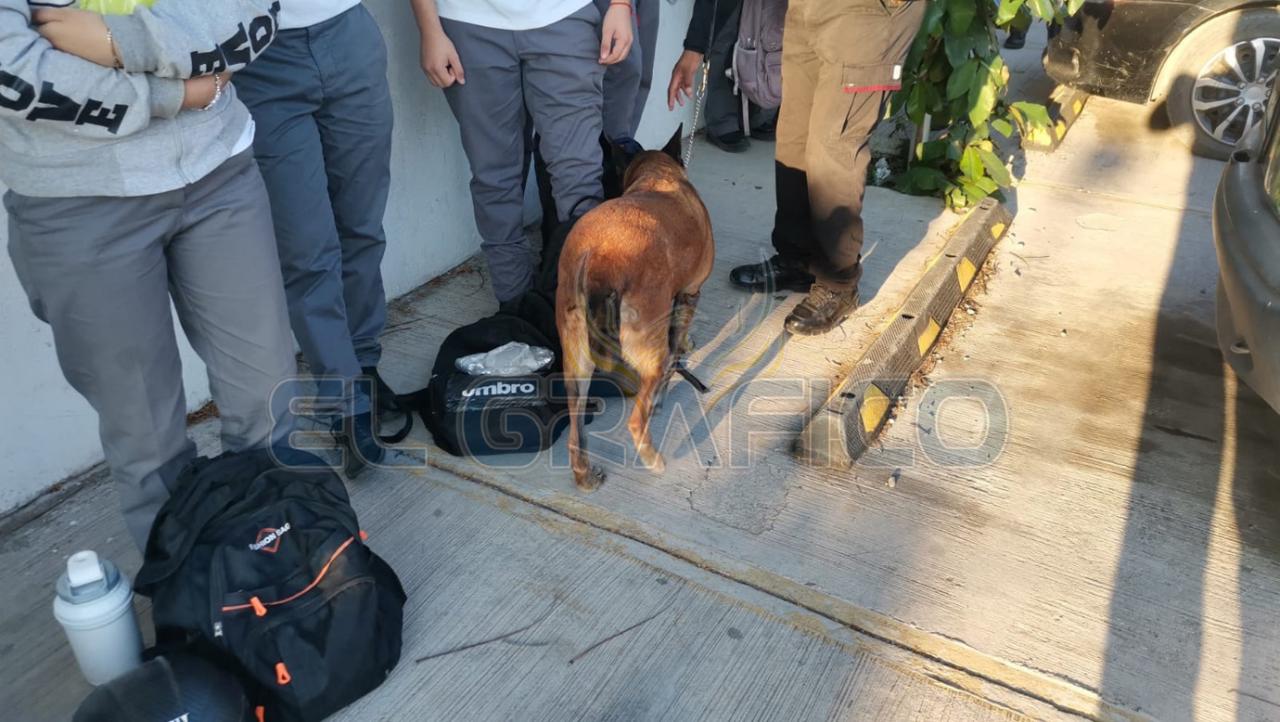 Al exterior del plantel escolar que se encuentra en la Avenida Tecnológico, mientras el binomio canino y personal del plantel educativo llevaban a cabo la revisión de las mochilas, se formó una larga fila de estudiantes.