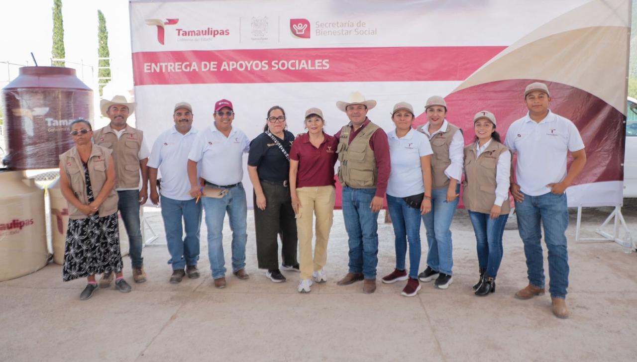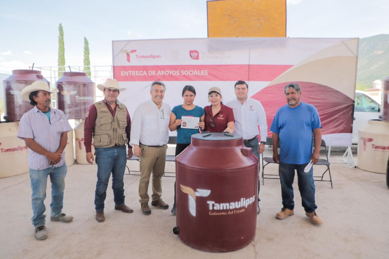 Tula, Tamaulipas.- Cumpliendo con la palabra dada por el gobernador Américo Villarreal Anaya a los habitantes del ejido Francisco Villa del municipio de Tula, la secretaría de Bienestar Social (SEBIEN), Silvia Casas González realizó la entrega de tinacos a los residentes de esta zona del estado.