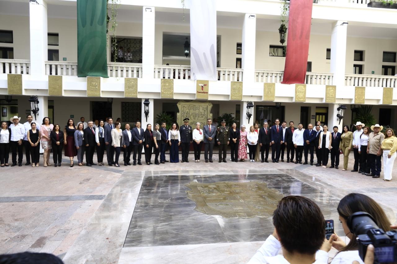Al término de la ceremonia, y de manera simultánea con las y los 43 alcaldes, fueron develados los escudos municipales, que representan el camino recorrido por Tamaulipas.