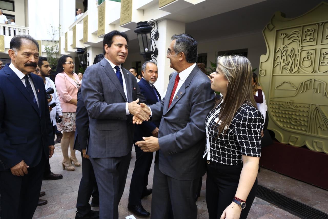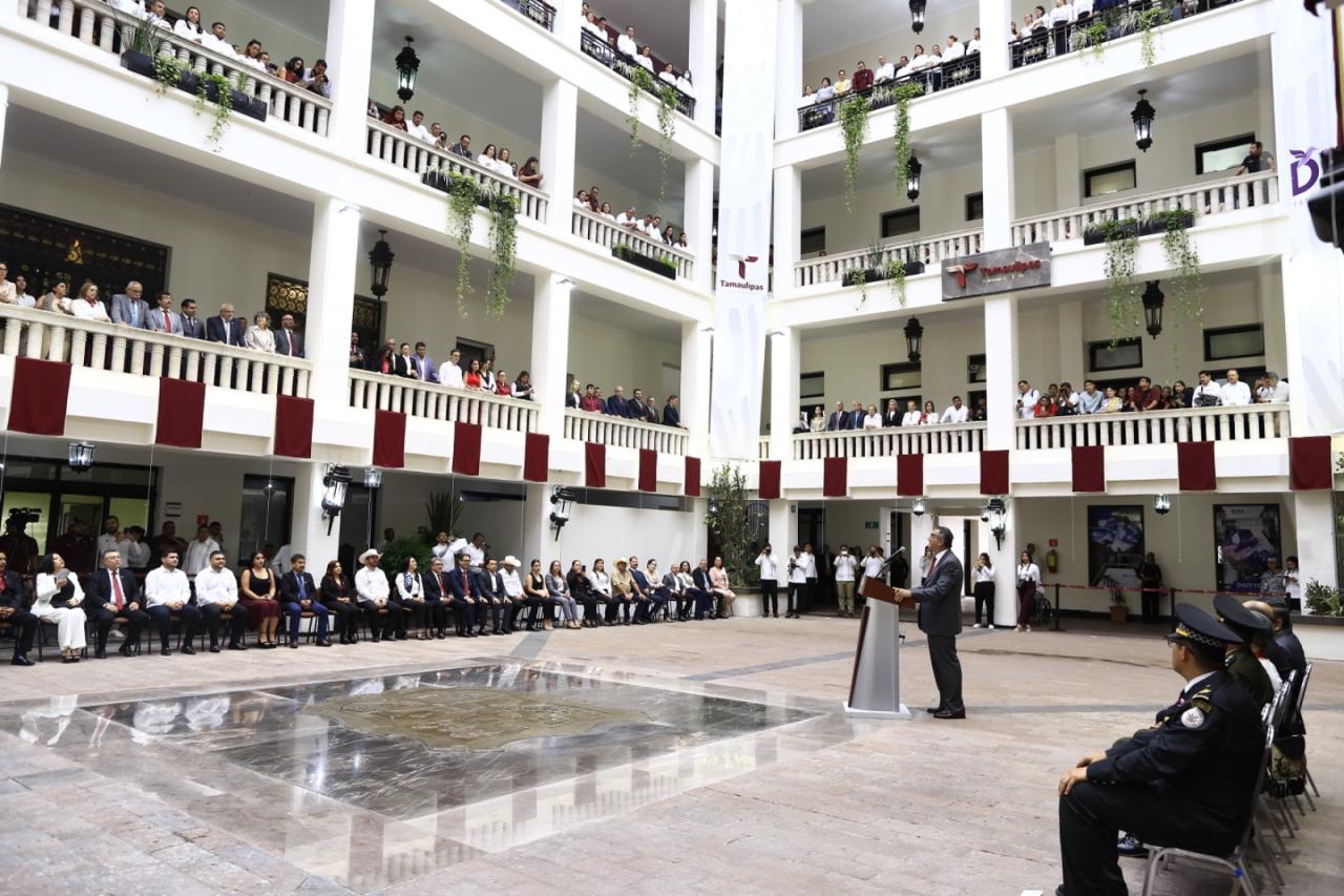 “Por el momento histórico que nos reúne, es un honor en esta ceremonia cívica de honores a la bandera nacional, en la que también rendimos tributo a los símbolos de la entidad tamaulipeca, que podamos recibirles en esta casa, un recinto que se ha dignificado, que recupera presencia y mejora las condiciones para estar a la altura de una sociedad que valora, y que valora mucho, lo que nos pertenece a todos y que forma, además, una parte de nuestra historia”, señaló.