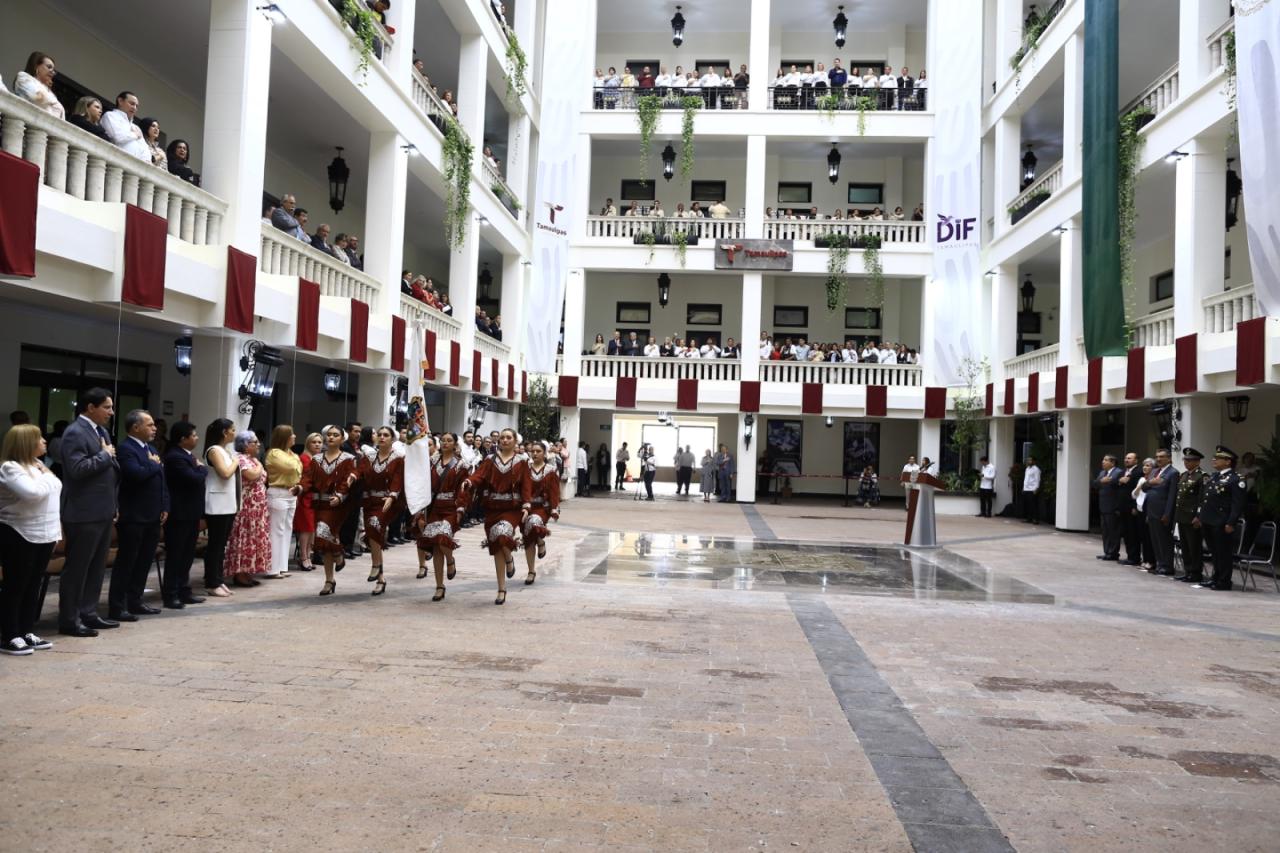 Durante este evento, correspondió a Lluvia Cobos decir el juramento a la bandera, y las efemérides nacionales y estatales a Asunción Osorio y Eduardo Zúñiga, respectivamente, mientras que en el presídium estuvieron el general DEM Enrique García Jaramillo, comandante de la 48 Zona Militar; el general brigadier DEM, el secretario general de Gobierno, Héctor Joel Villegas González, y el secretario de Seguridad Pública, Sergio Hernando Chávez García.