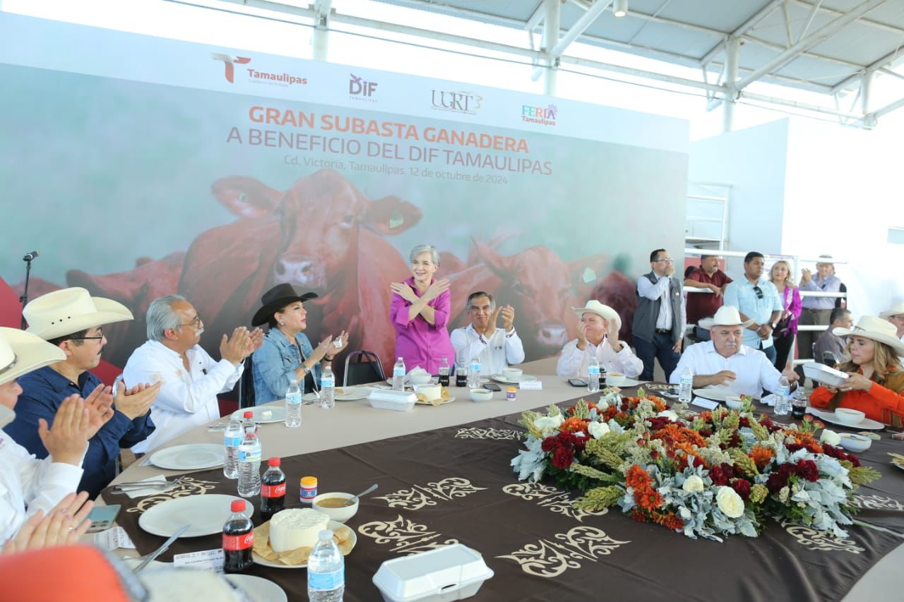 En su mensaje, el gobernador Américo Villarreal agradeció, a nombre de su esposa, los recursos aportados por la familia ganadera de Tamaulipas en esta magnífica subasta, que contribuirán a fortalecer los programas de integración social en beneficio de los niños, niñas y mujeres en situaciones difíciles.