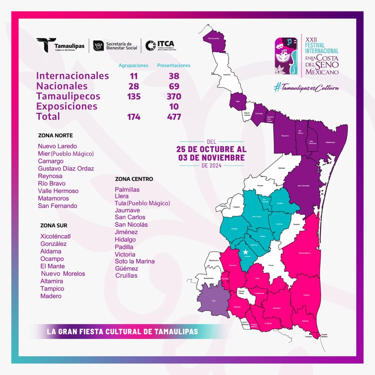 La cartelera tamaulipeca dará protagonismo a artistas de la región con 370 presentaciones, mientras que la cartelera nacional e internacional traerá a renombrados talentos que llenarán teatros y plazas con espectáculos de primer nivel. En total habrá 69 presentaciones nacionales y 38 internacionales, además de 10 exposiciones, sumando un total de 477 actividades por todo el estado.