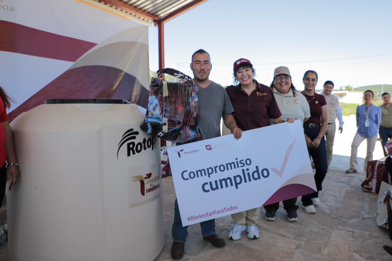 San Nicolás, Tamaulipas. - En cumplimiento con el compromiso del Gobierno de Tamaulipas, de llevar apoyos a las familias más vulnerables de la región, la secretaria de Bienestar Social, (SEBIEN) Silvia Casas González, en representación del gobernador Américo Villarreal Anaya, encabezó la entrega de 24 tinacos con una capacidad de mil 100 litros en el ejido General Lauro Villar, del municipio de San Nicolás.