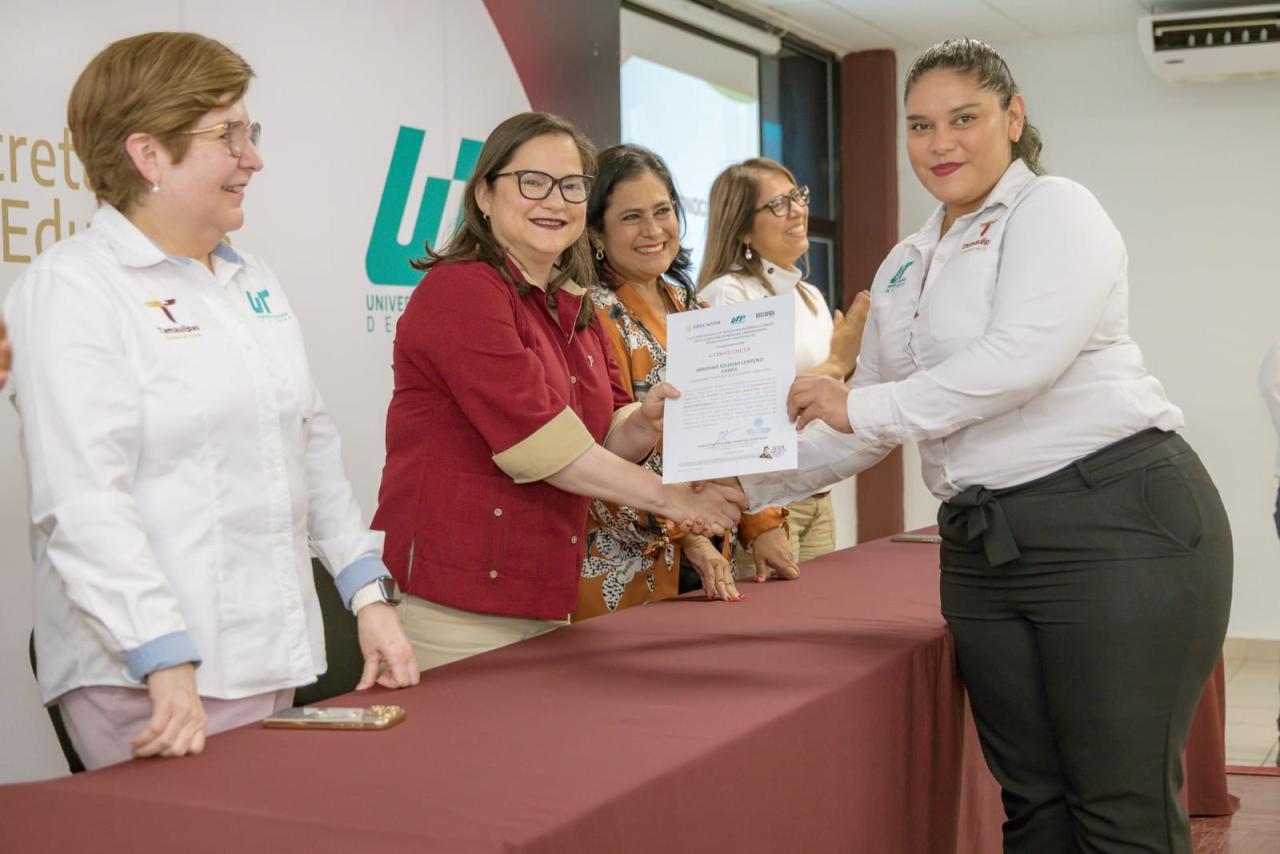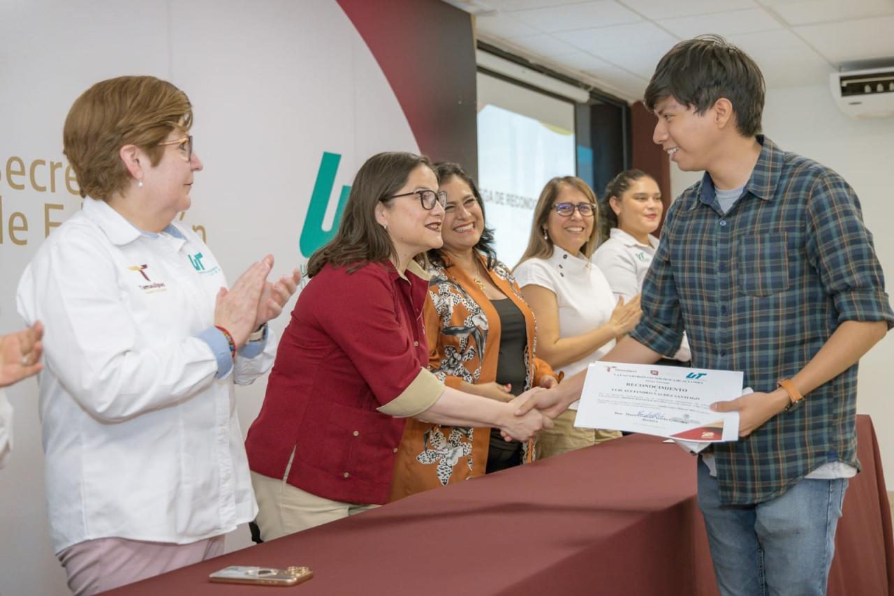 Altamira, Tamaulipas.- Con el propósito de revalorizar la labor de las y los docentes y a la base trabajadora del sector educativo, tal como lo ha manifestado el gobernador Américo Villarreal Anaya, el Gobierno de Tamaulipas, a través de la Secretaría de Educación, entregó reconocimientos a maestras, maestros y personal administrativo de la Universidad Tecnológica de Altamira.