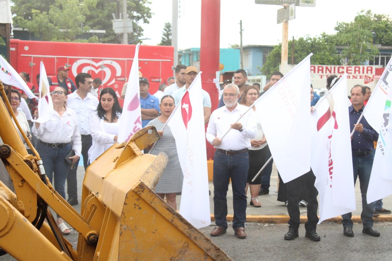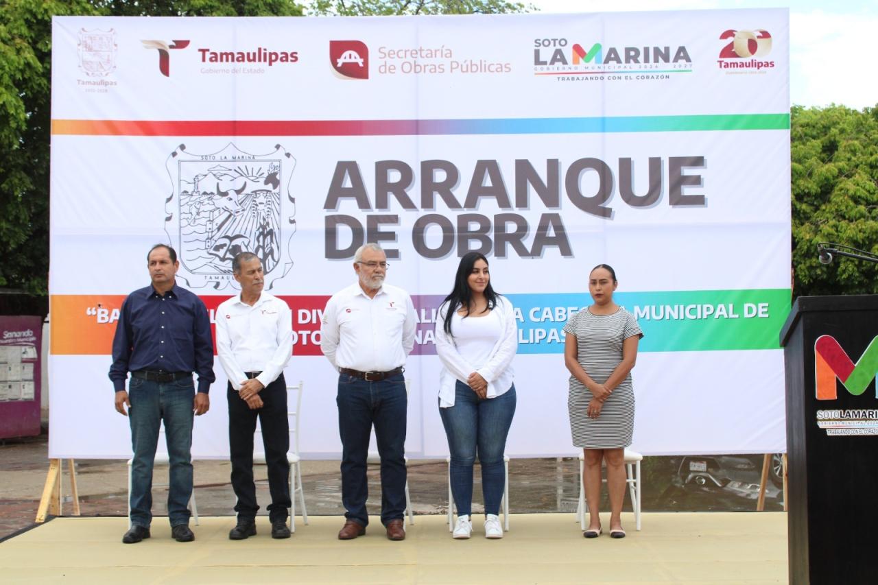 La alcaldesa de Soto la Marina, Glynnis Georgina Jiménez Vázquez estuvo presente en el banderazo que dio el titular de la SOP, Pedro Cepeda Anaya para dar inicio a esta obra que se llevará a cabo en diversas calles.