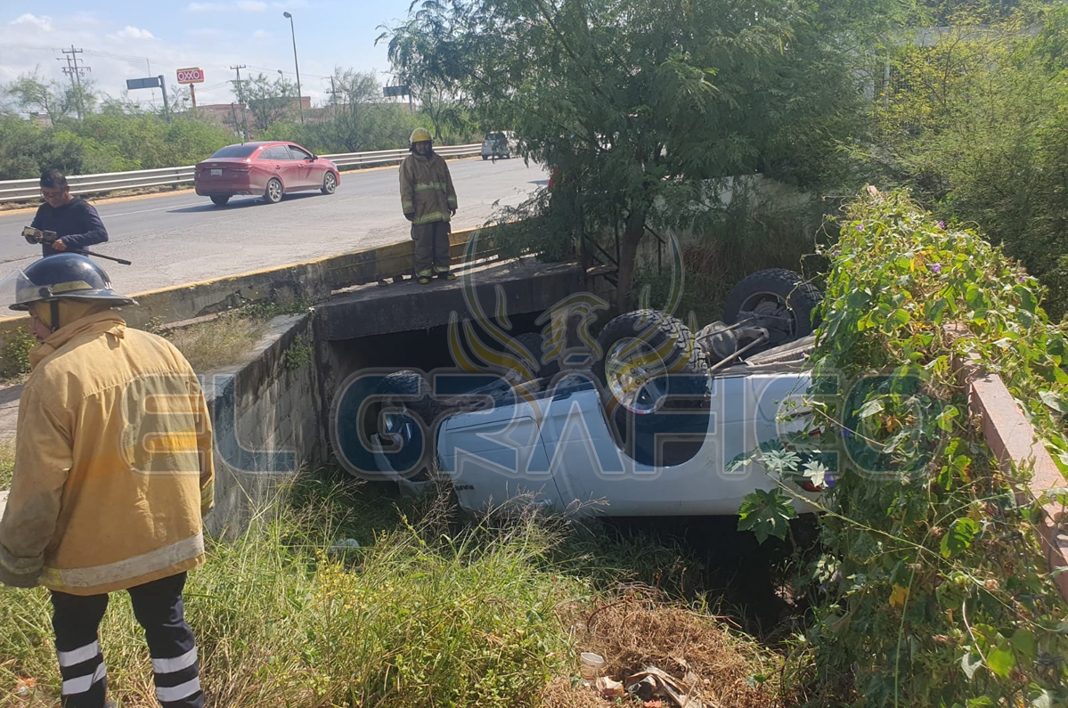 Por recoger un almuerzo en un restaurante ubicado en el Libramiento Naciones Unidas, un conductor terminó con su camioneta volcada en un canal pluvial.