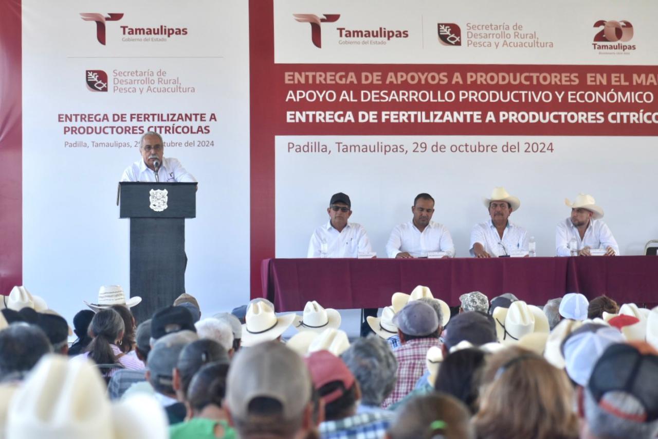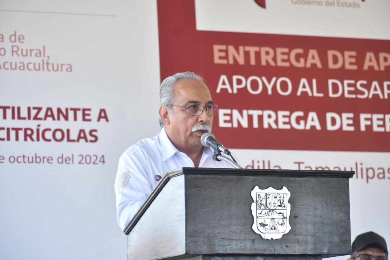 Antonio Rodríguez Méndez, en representación del presidente municipal de Hidalgo resaltó que sin duda alguna este evento es muy importante porque los citricultores reciben una vez más el apoyo de fertilizante, y estan al tanto de los apoyos que brinda el gobernador, Américo Villarreal Anaya, que son de gran ayuda para este importante sector que es la citricultura.