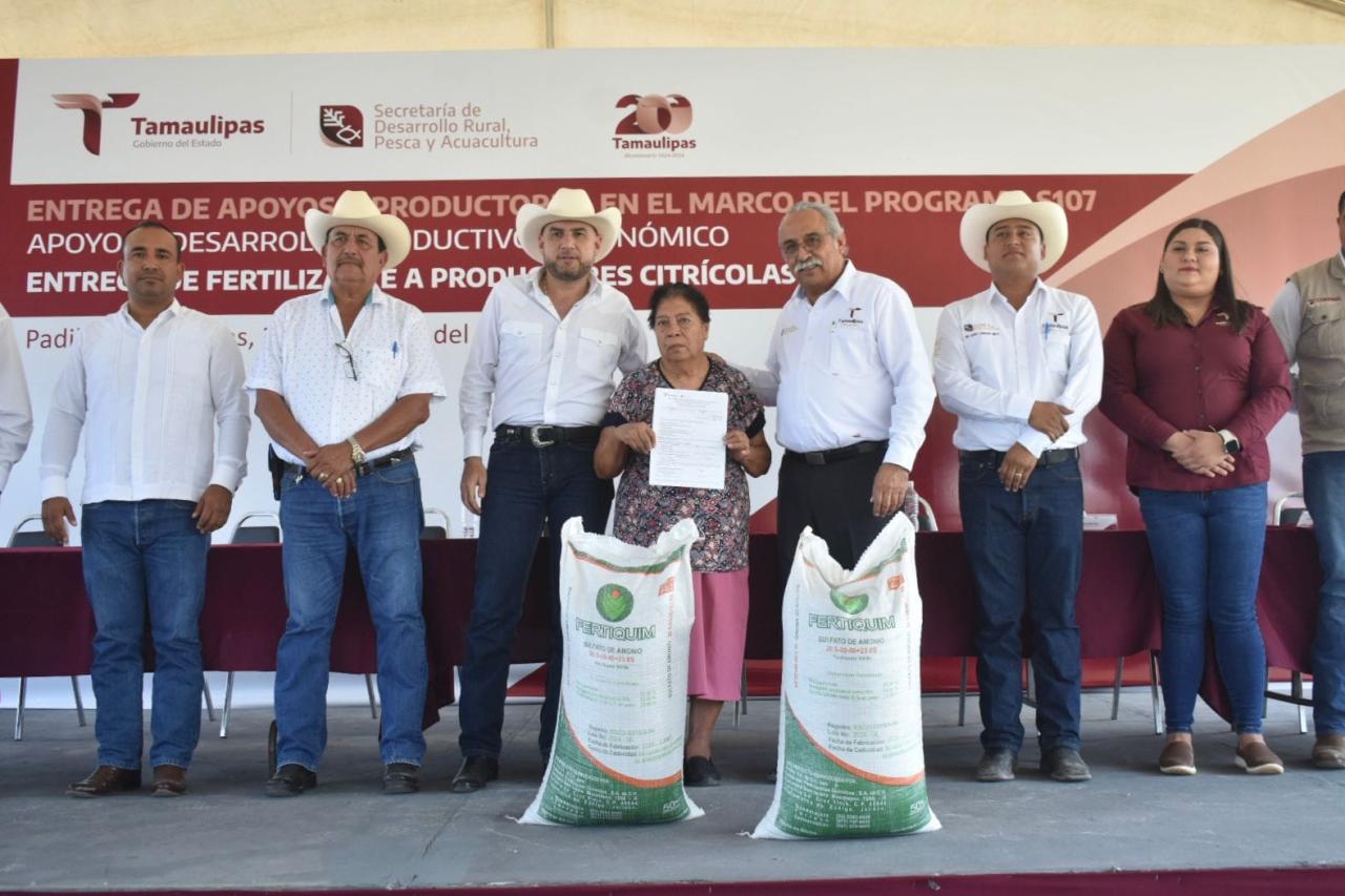 Padilla, Tamaulipas. – En apoyo a los citricultores del sector social de Tamaulipas, el gobernador Américo Villarreal Anaya, a través de la Secretaría de Desarrollo Rural, Pesca y Acuacultura dispuso la entrega de 280 toneladas de fertilizante granulado sulfato de amonio como parte del programa 107 Apoyo al Desarrollo Productivo y Económico, en donde se destinó un presupuesto de 15 millones de pesos.