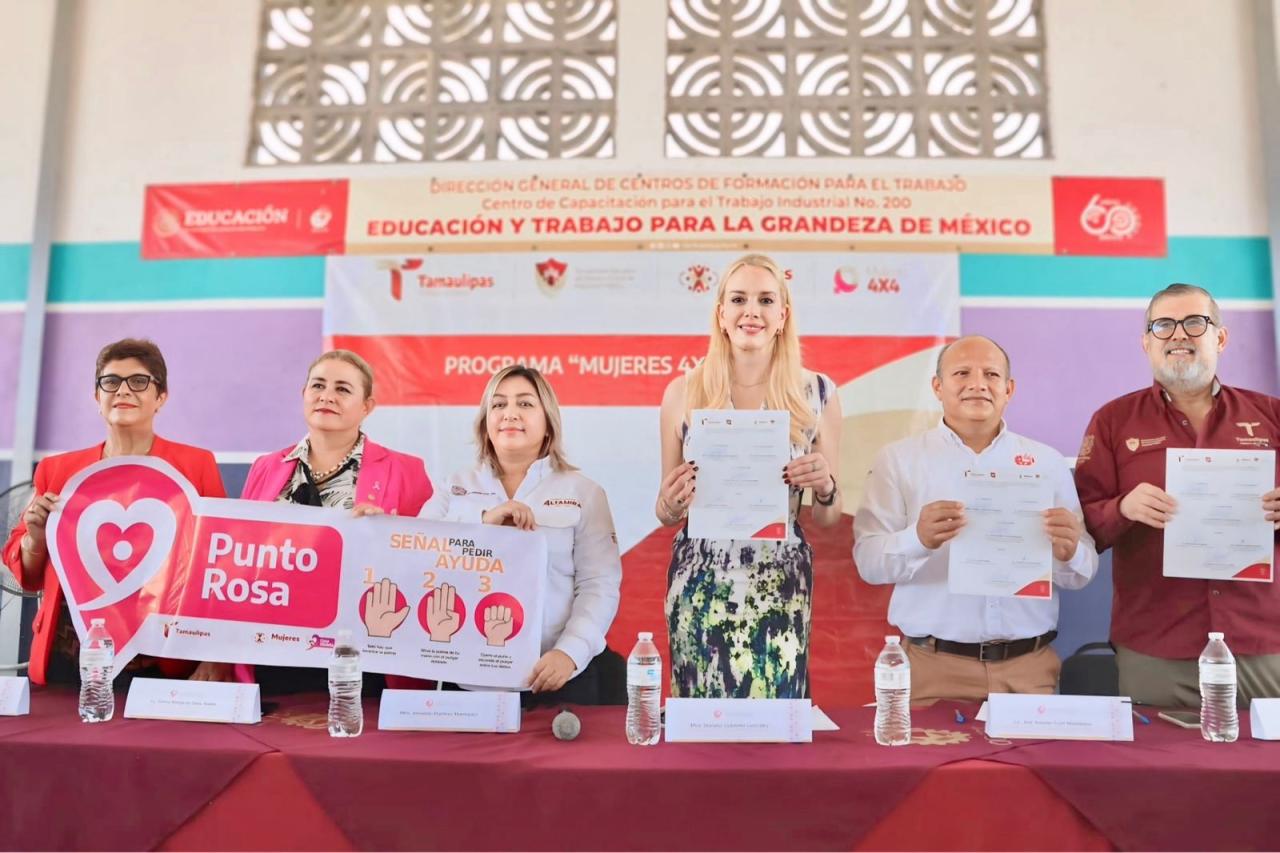 Altamira, Tamaulipas. - En un esfuerzo comprometido con el empoderamiento de las mujeres y la erradicación de la violencia de género, este miércoles se realizó la ceremonia de clausura del programa Mujeres 4×4 junto con la firma de un convenio entre el Instituto de las Mujeres en Tamaulipas y Punto Rosa en el Centro de Capacitación para el Trabajo Industrial (CECATI) No. 200, en Altamira.