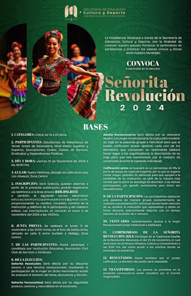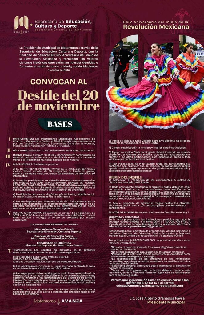 El Ayuntamiento de Matamoros, Tamaulipas, tiene el honor de invitar a toda la comunidad a celebrar juntos la conmemoraciуn del inicio de la Revoluciуn Mexicana este 20 de noviembre. En esta fecha emblemбtica, rendiremos homenaje con un desfile a las mujeres y hombres valientes que, con su lucha y sacrificio, marcaron el rumbo de nuestra naciуn y dieron vida a los ideales de justicia, libertad e igualdad que hoy nos inspiran.
