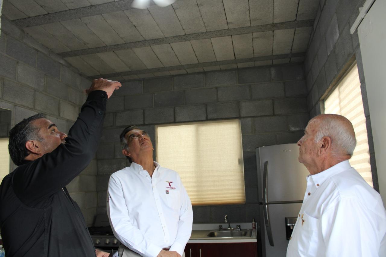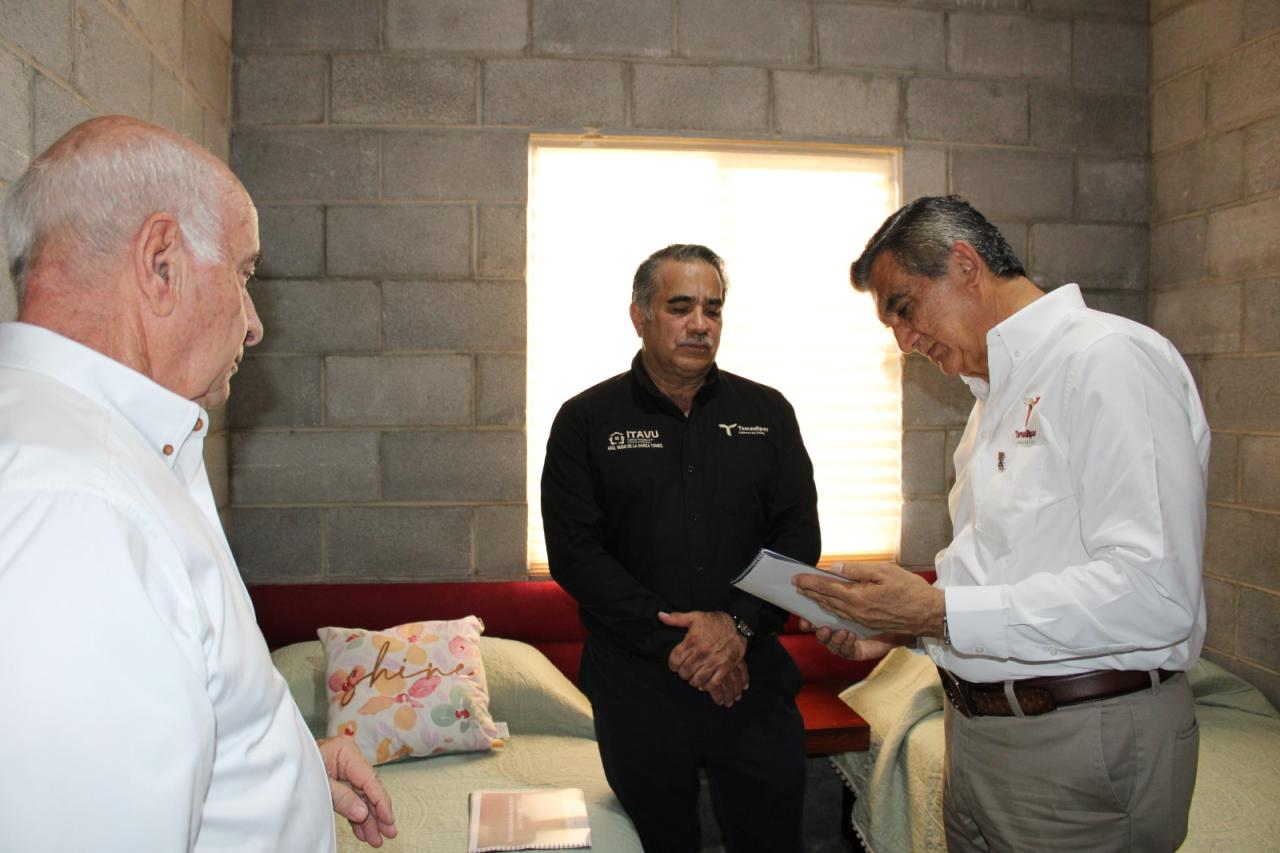 Durante un recorrido por las instalaciones del ITAVU, el gobernador Américo Villarreal Anaya conoció los detalles de este proyecto. Observó que la estructura se levanta con muros de block de concreto reforzados con castillos ahogados y un techo de viguetas prefabricadas pretensadas y bovedilla de concreto, una técnica que reduce costos al eliminar el uso de cimbras. Además, cuenta con instalaciones eléctricas adecuadas, con sus contactos, suficiente iluminación, así como ventanas de aluminio modulares con mosquiteros y puertas multipanel en medidas estándar, lo cual garantiza un mantenimiento sencillo y prolongada vida útil de los elementos.