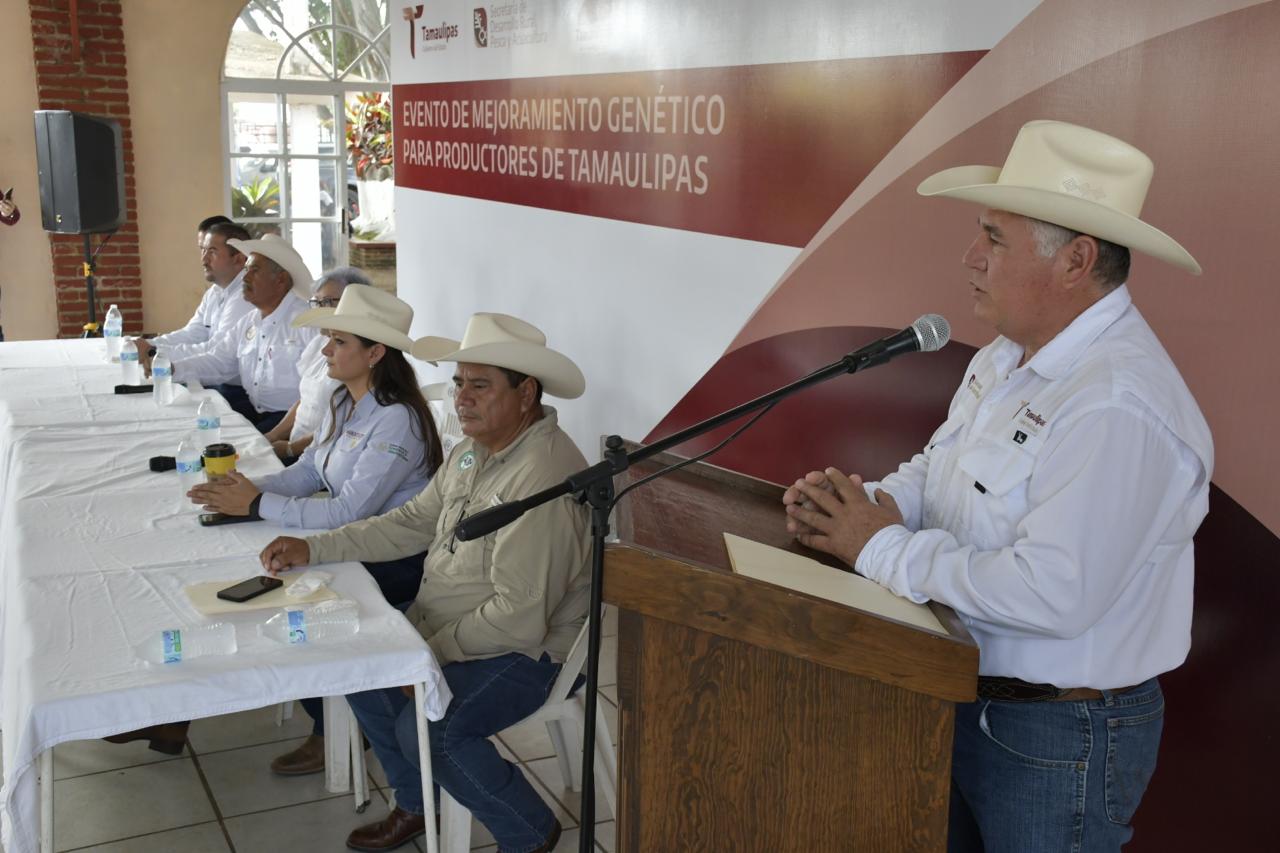 Tirzo Zumaya Turrubiates, director de Fomento Pecuario, en representación del secretario de Desarrollo Rural, Pesca y Acuacultura, Antonio Varela Flores encabezó el evento de mejoramiento genético y destacó que el gobernador Américo Villarreal Anaya trabaja de manera coordinada con las diferentes instancias, siempre buscando mejorar la sanidad animal, el estatus sanitario del estado, que permita ofertar hacia otros países el ganado tamaulipeco a un mejor precio.