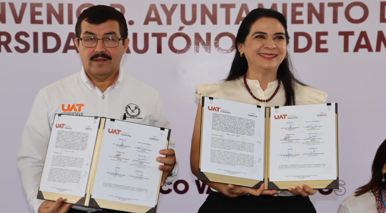 La Universidad Autónoma de Tamaulipas (UAT) y el Ayuntamiento de Tampico formalizaron la colaboración en proyectos conjuntos en beneficio de la comunidad, y el compromiso de sumar sus fortalezas para contribuir a consolidar la transformación de Tamaulipas.
