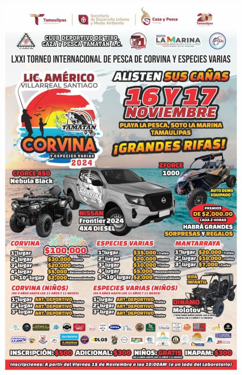 Ciudad Victoria, Tamaulipas.- Este 16 y 17 de noviembre, la playa La Pesca en el municipio de Soto la Marina será el escenario del 71º Torneo Internacional de Pesca de Corvina y Especies Varias “Américo Villarreal Santiago”.