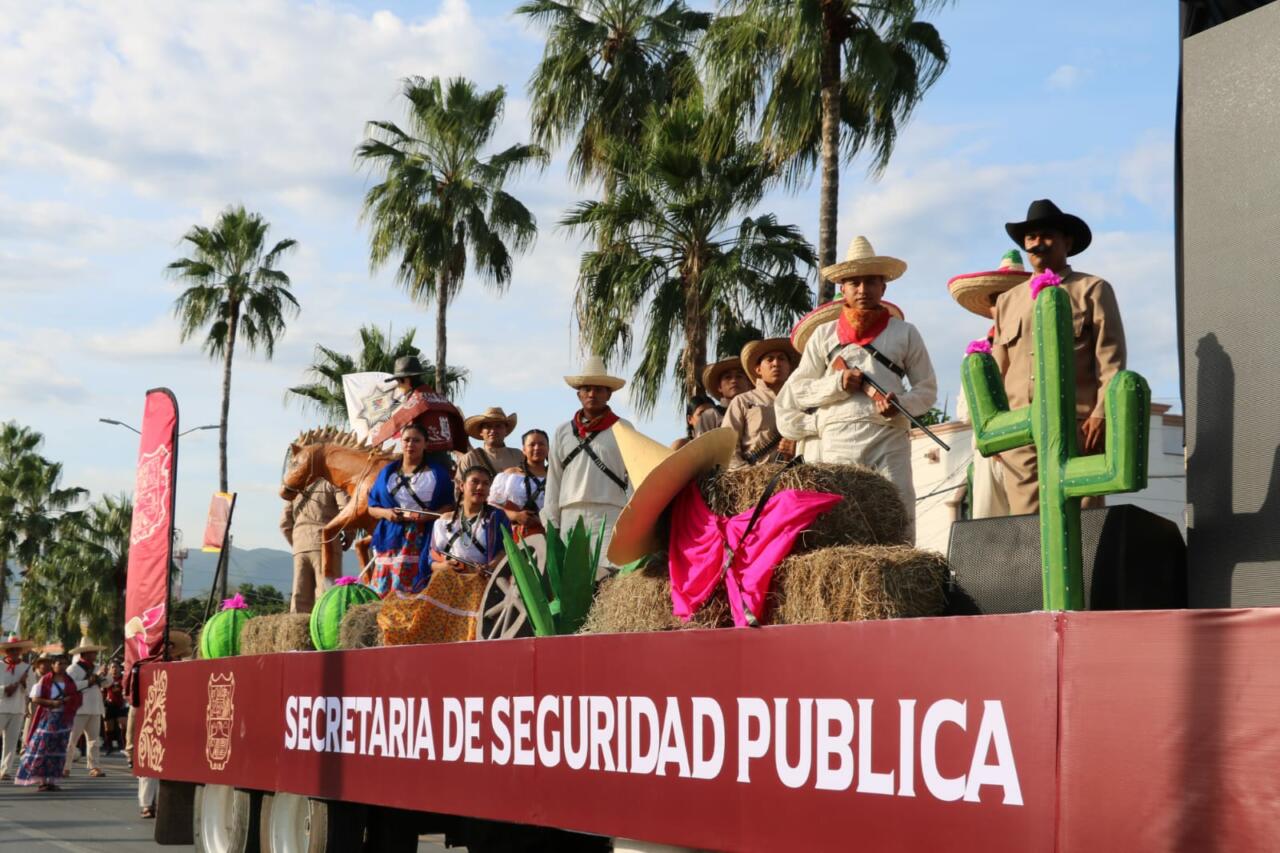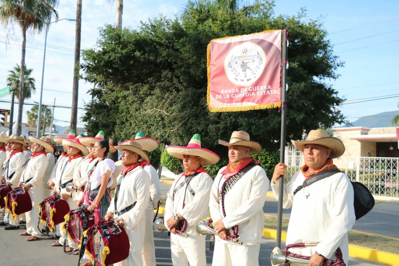 Marcando la cadencia, la Banda de Guerra de la Guardia Estatal avanzó sobre la Avenida Tamaulipas y dio paso al carro alegórico que proyectó una reseña histórica sobre la participación de personajes oriundos de la entidad en la lucha armada del 20 de noviembre de 1910 destacando el papel de las mujeres conocidas como “adelitas” o “soldaderas”, mismas que fueron representadas por colaboradoras de esta dependencia.