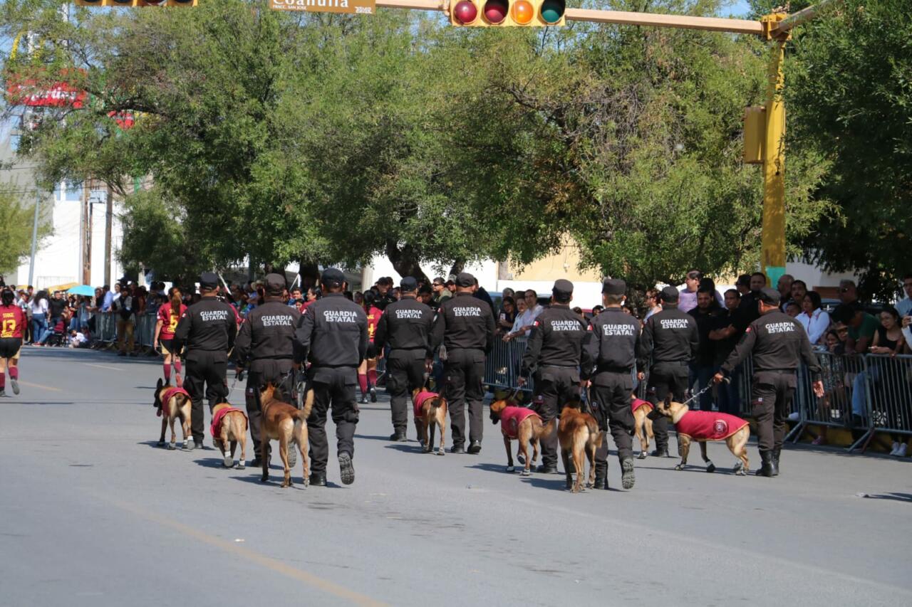 Conformado por binomios policiales, especializados en búsqueda de papel moneda, narcóticos, restos óseos y artefactos explosivos, el agrupamiento canino de la Guardia Estatal se unió a este acto cívico demostrando parte del entrenamiento de sus integrantes.
