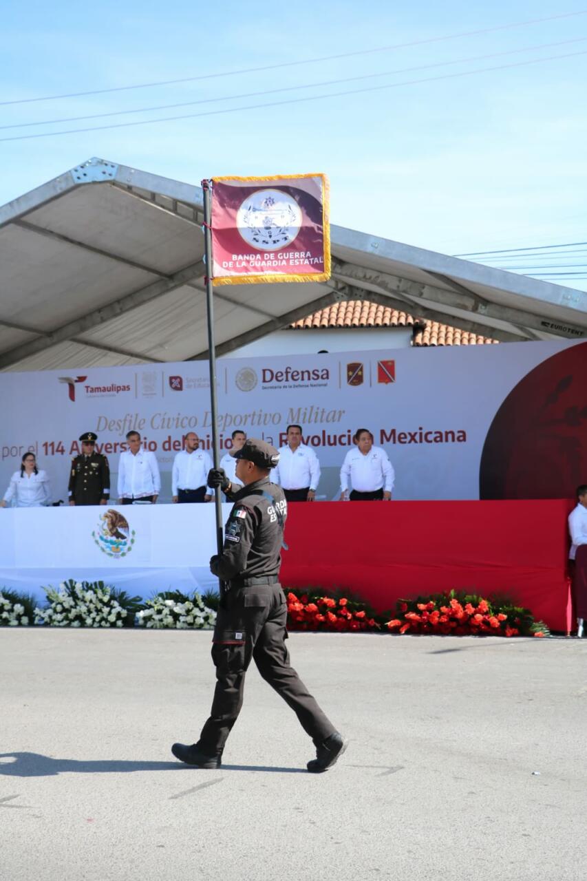 Ante el gobernador, Américo Villarreal Anaya; el titular de la SSPT, Sergio Hernando Chávez García, integrantes de la línea de honor y público en general, desfiló el contingente encabezado por las escoltas varonil y femenil, quienes portaron la bandera nacional y el escudo de Tamaulipas, respectivamente.