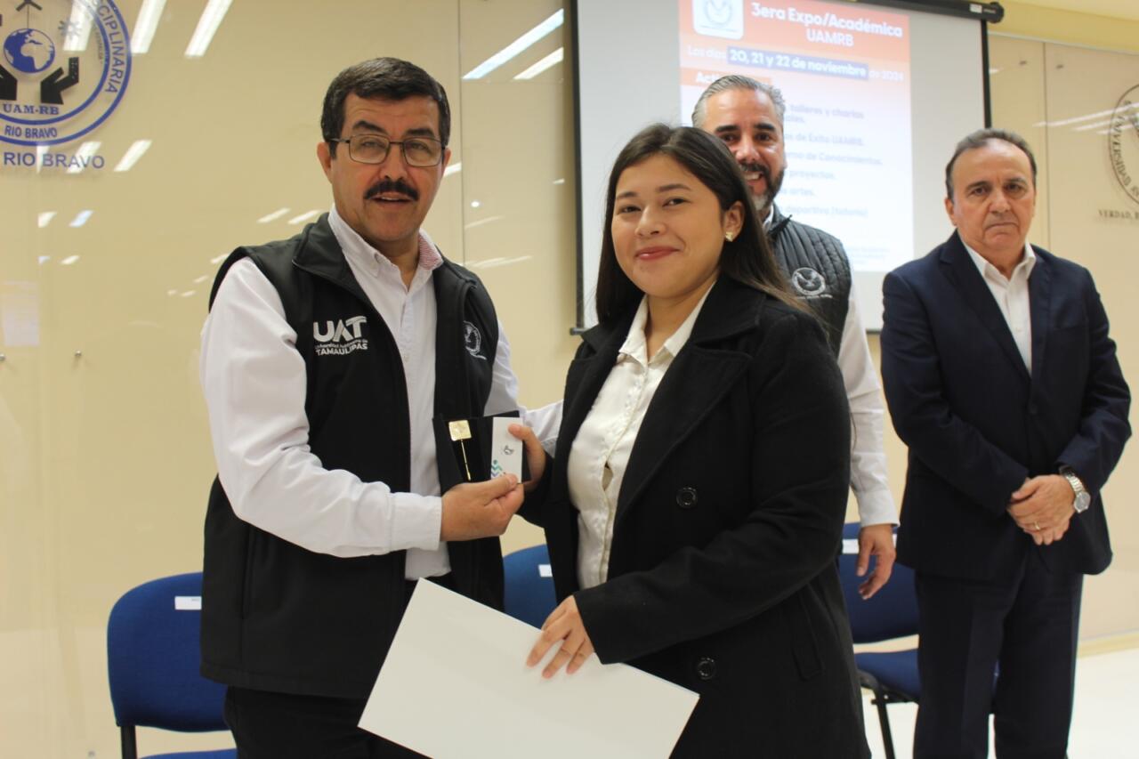 Durante su visita, el rector entregó un reconocimiento a Alexsandra Guerra Jarquín, recién egresada de la carrera de Negocios Internacionales, por haber obtenido el Premio Ceneval de Excelencia EGEL en Comercio.