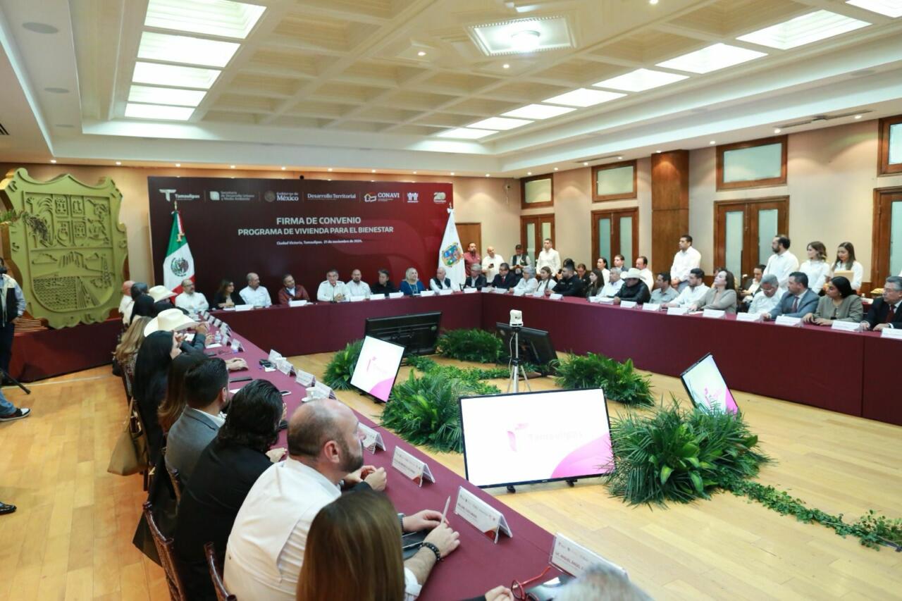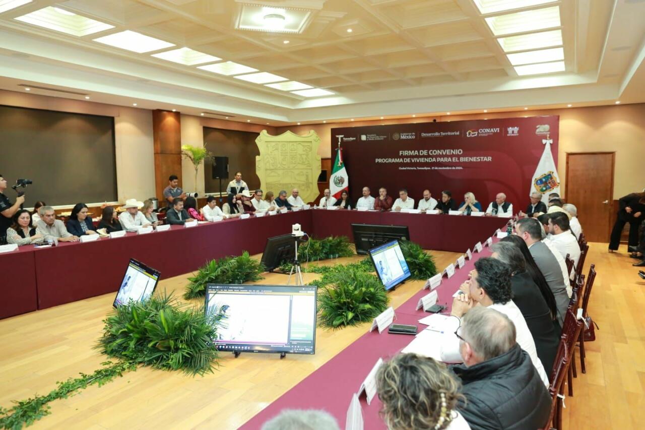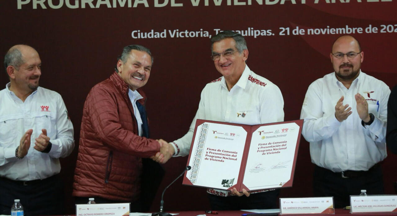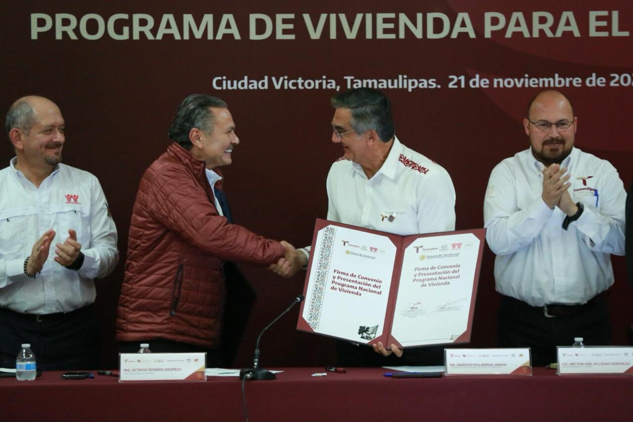 Ciudad Victoria, Tamaulipas.- A poco más de un mes de haber iniciado el gobierno de la presidenta Claudia Sheinbaum, en Tamaulipas ya se aterrizan los programas para el desarrollo y bienestar social, aseguró el gobernador Américo Villarreal Anaya al firmar con el director general del Instituto del Fondo Nacional de la Vivienda para los Trabajadores (INFONAVIT), Octavio Romero Oropeza, el convenio de colaboración que permitirá la construcción de 43 mil viviendas en 29 municipios del estado y el otorgamiento de 55 mil créditos.