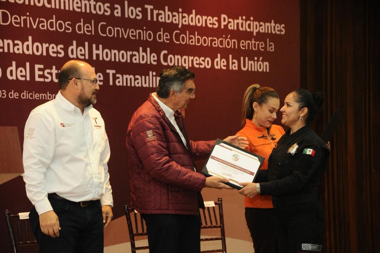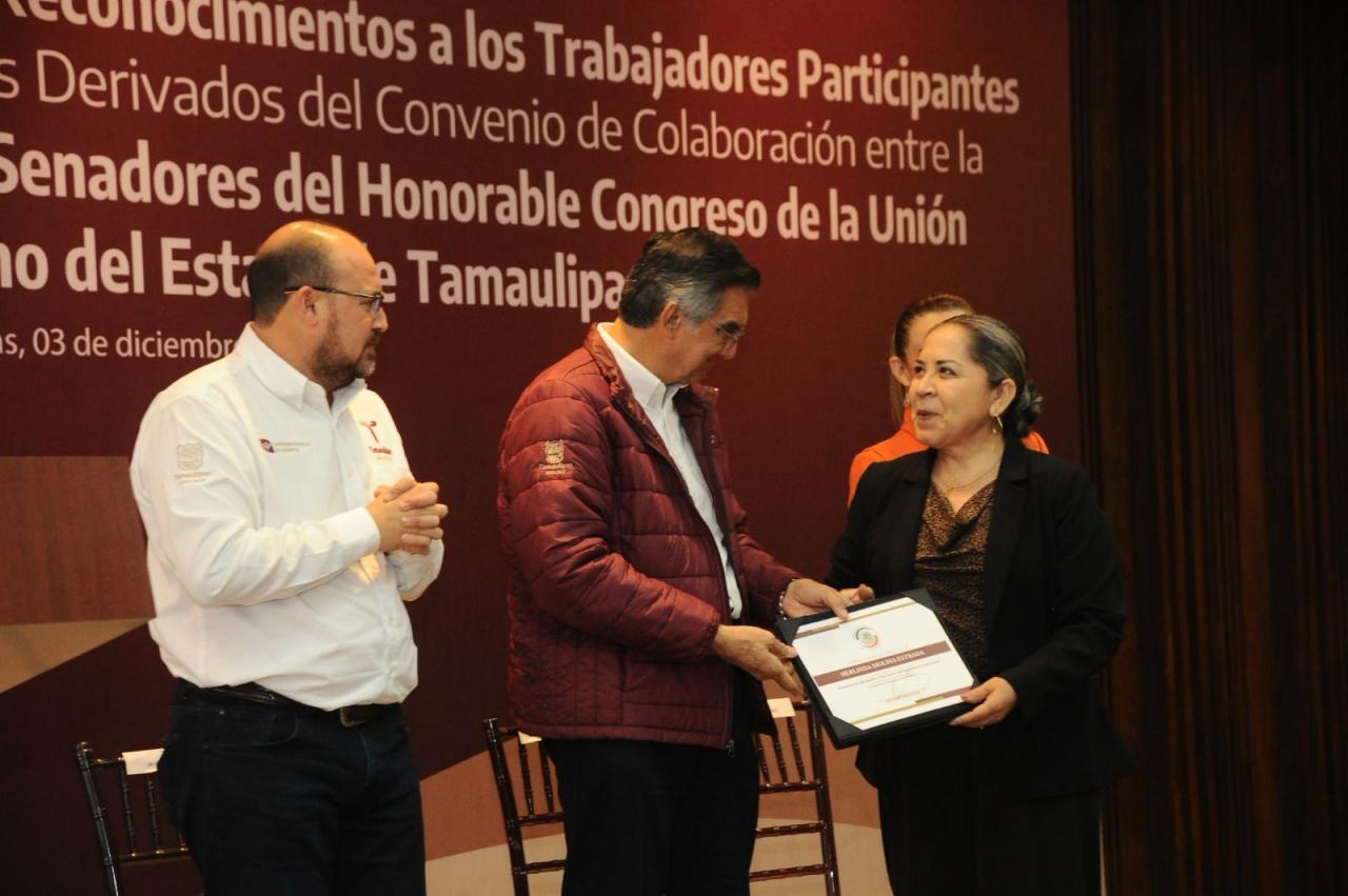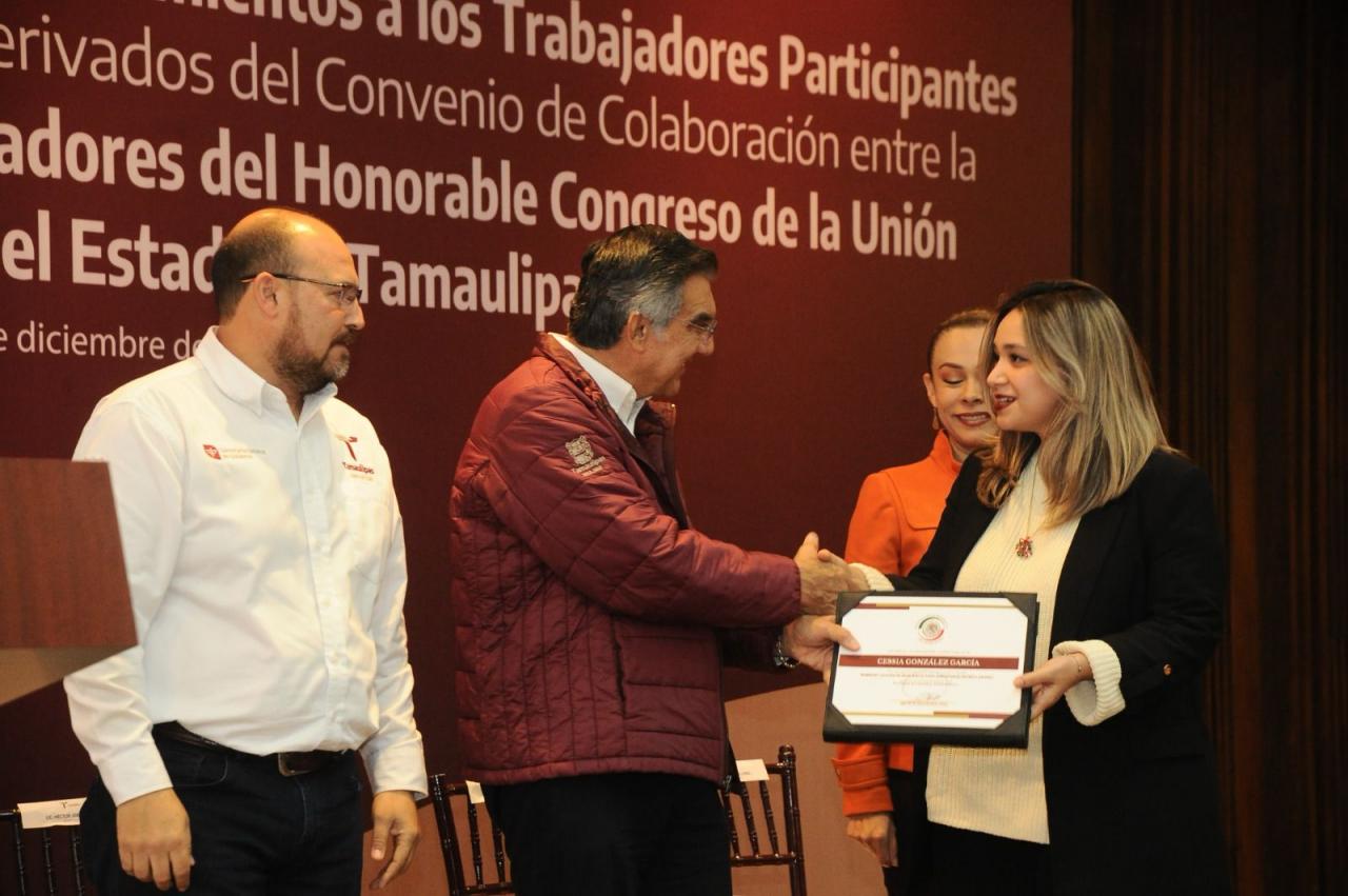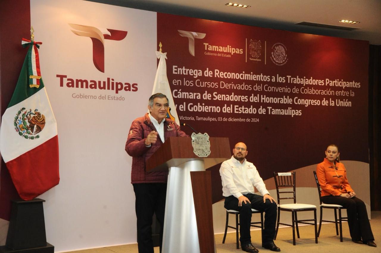 Ciudad Victoria, Tamaulipas.- Al señalar que es prioridad para su gobierno que las y los servidores públicos se capaciten de manera continua, el gobernador de Tamaulipas, Américo Villarreal Anaya, hizo entrega de 59 reconocimientos a personal de diferentes secretarías que concluyeron cursos de capacitación derivados del Convenio de Colaboración entre la Cámara de Senadores del Congreso de la Unión y el Gobierno de Tamaulipas.