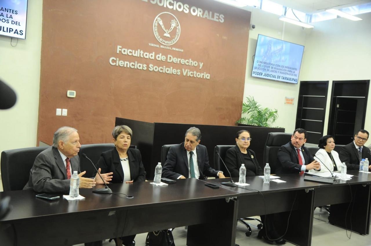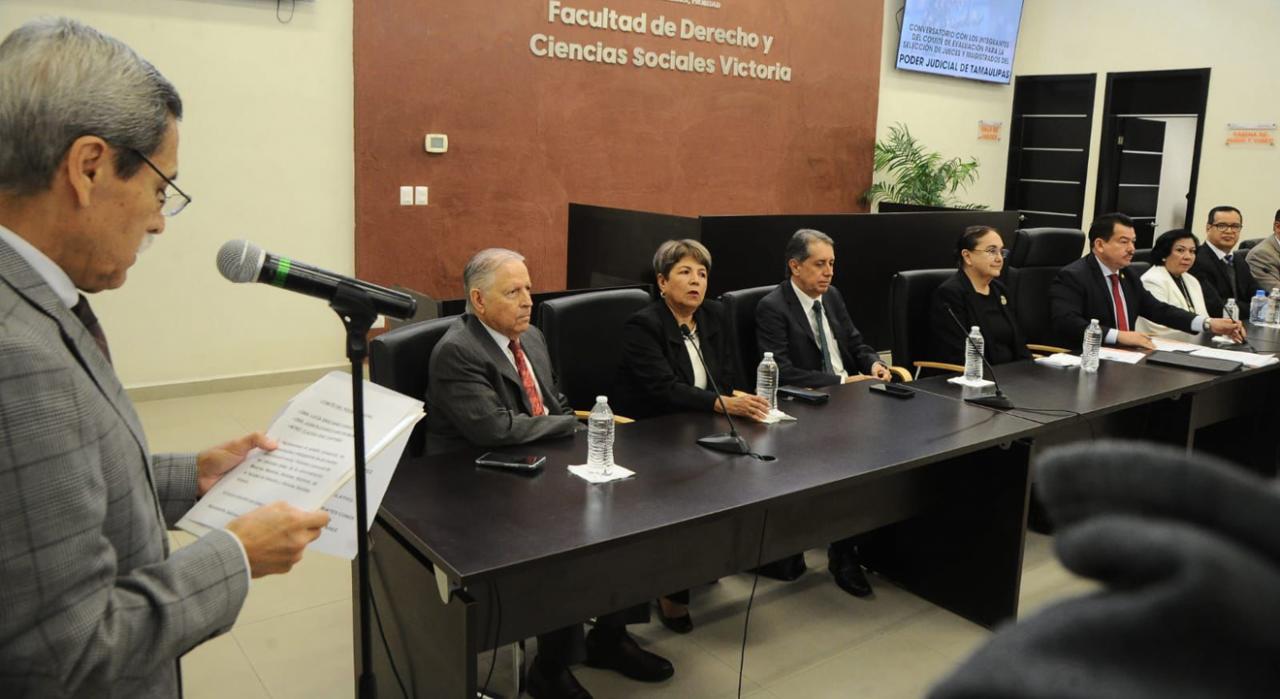 Durante un conversatorio celebrado en la Sala de Juicios Orales de la Facultad de Derecho y Ciencias Sociales de la Universidad Autónoma de Tamaulipas, los integrantes de los Comités de Evaluación de los Poderes Ejecutivo, Legislativo y Judicial respondieron a todos los cuestionamientos y dudas sobre el proceso que está en marcha, primero con la expedición de la convocatoria y actualmente con la recepción de registros de todos los interesados en la página https://eleccionjudicialtamaulipas.mx.