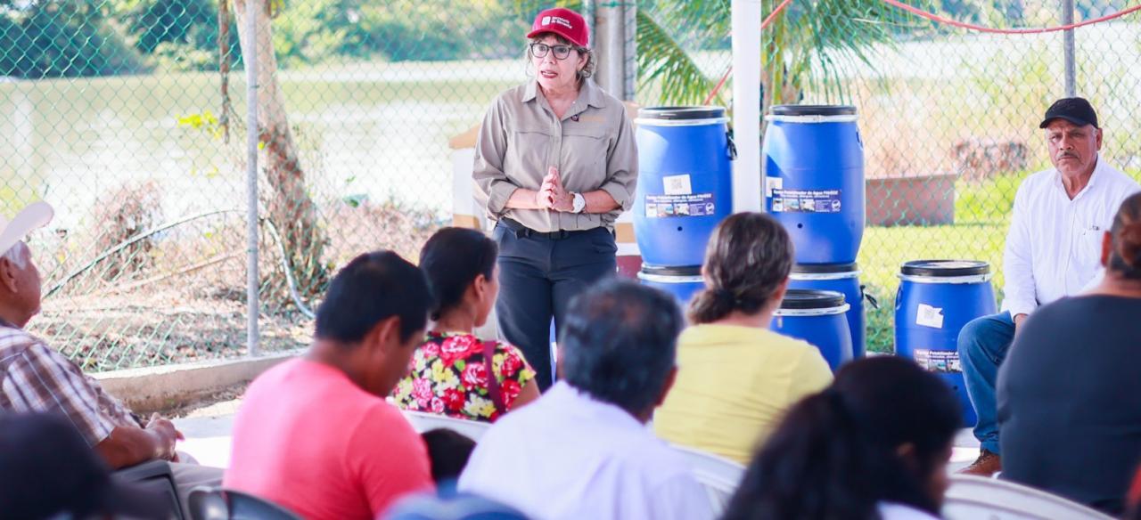 La titular de SEBIEN, Silvia Casas González, entregó de manera simbólica dispositivos de desinfección de agua, cada uno con capacidad de 60 litros y equipado con tecnología de microfiltración para eliminar turbidez, parásitos, bacterias y virus.