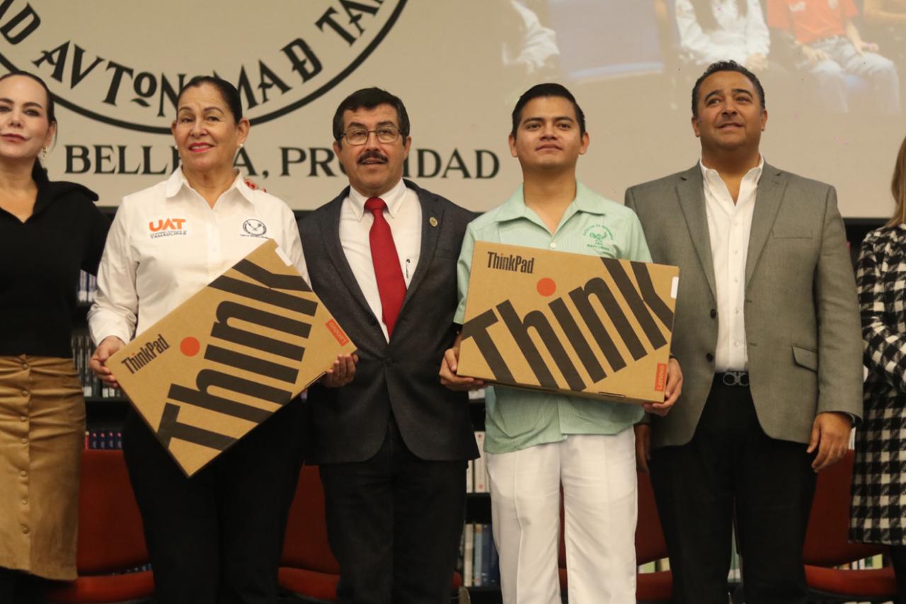 El rector de la Universidad Autónoma de Tamaulipas (UAT), Dámaso Anaya Alvarado, presidió en Nuevo Laredo la ceremonia de entrega de becas ITABEC y computadoras portátiles destinadas a fortalecer el desempeño académico de estudiantes y docentes de los planteles de la máxima casa de estudios ubicados en esta ciudad fronteriza.