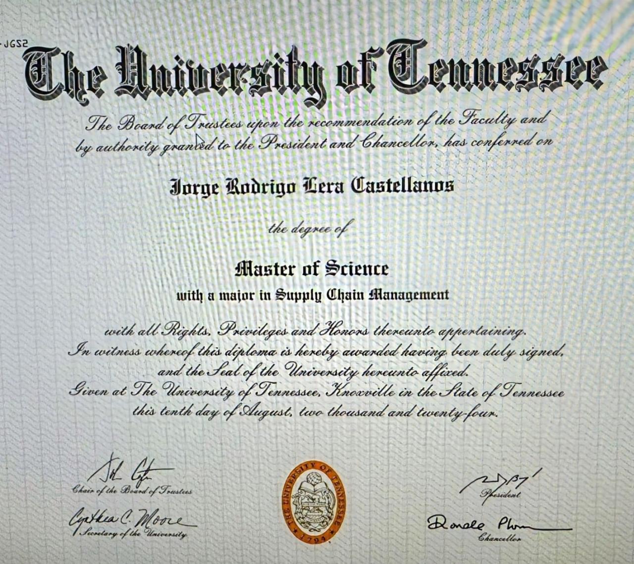 Este jueves y viernes, Jorge Rodrigo Lera Castellanos participará en la ceremonia de toque de campana en Knoxville, Tennessee, como parte de su graduación del programa de la Maestría en Cadena de Suministro (Supply Chain) por la Universidad de Tennessee.