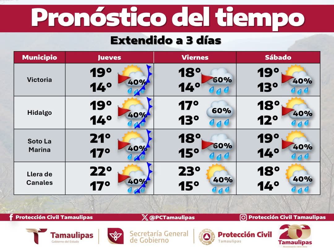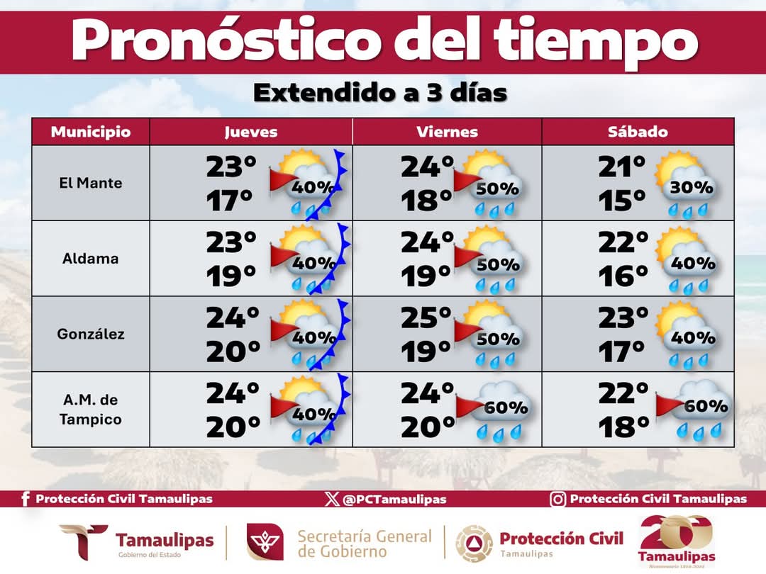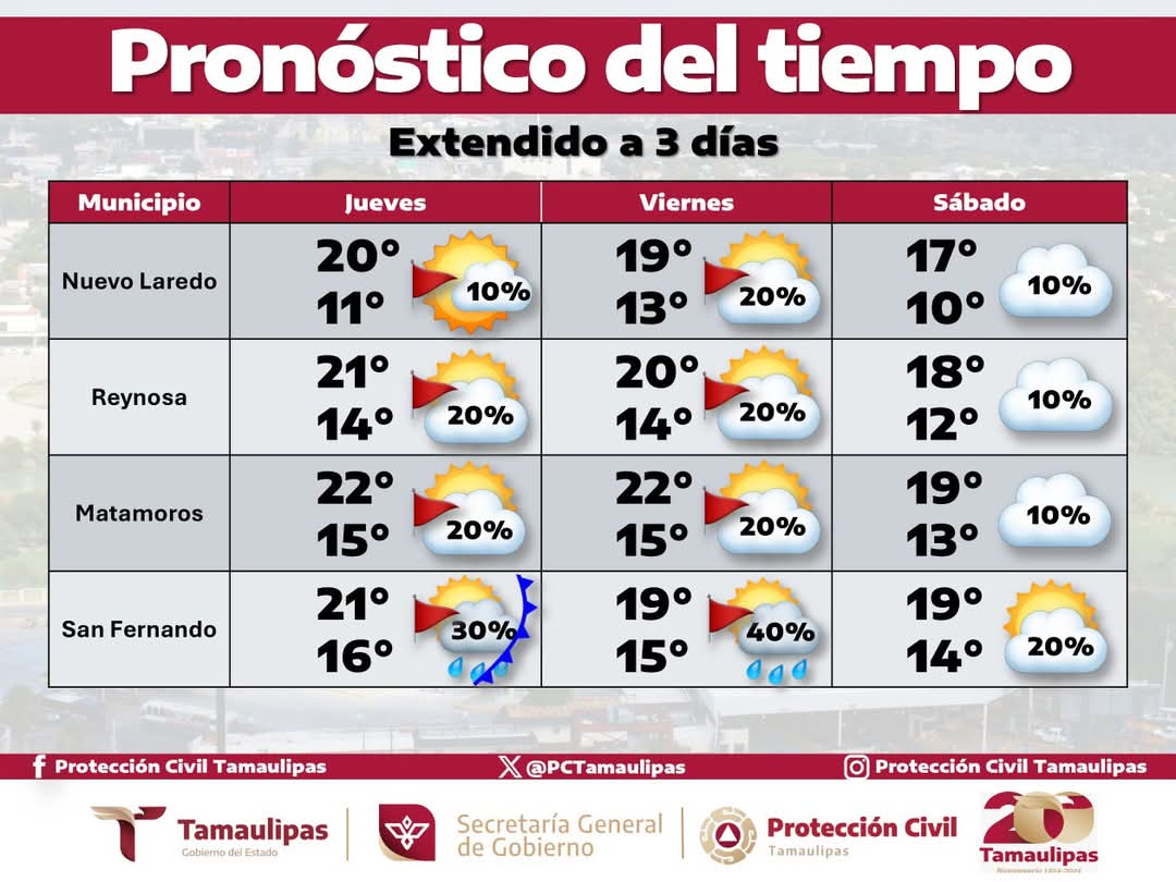 Protección Civil Tamaulipas informó que se espera evento de “Norte” con ráfagas de viento entre los 30 a 50 kilómetros por hora y ligero descenso térmico.