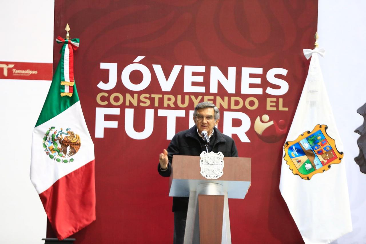 Ciudad Victoria, Tamaulipas.- El gobernador de Tamaulipas, Américo Villarreal Anaya, y el delegado de Bienestar Federal en la entidad, Luis Lauro Reyes Rodríguez, entregaron de manera simbólica la primera remesa de tarjetas 2025 del programa “Jóvenes Construyendo el Futuro”, donde reafirmaron el compromiso para apoyar a la juventud tamaulipeca.