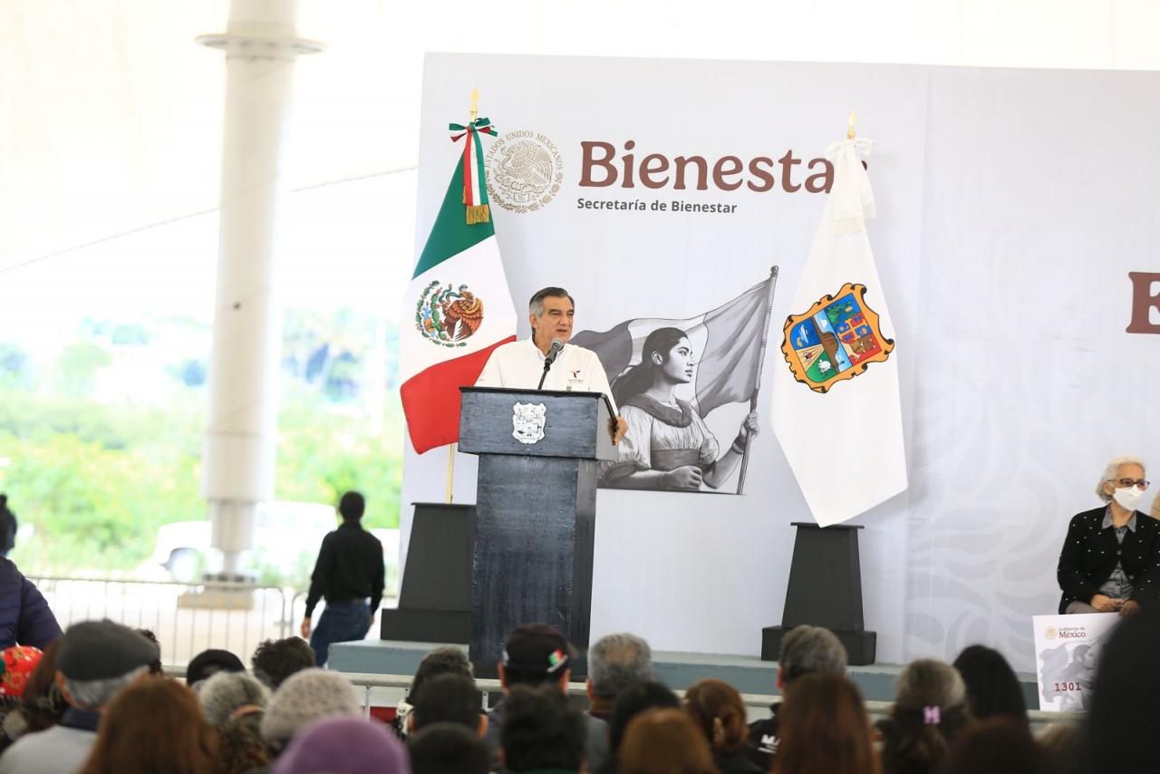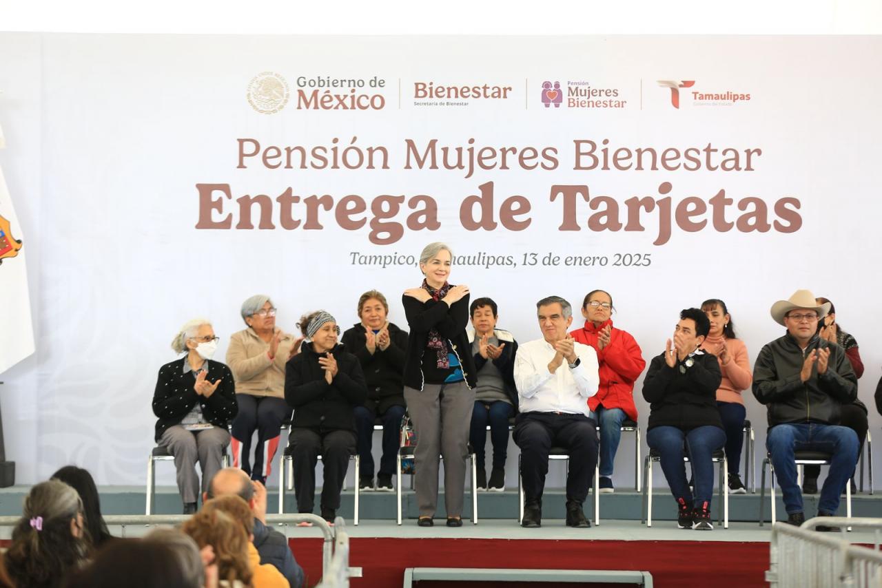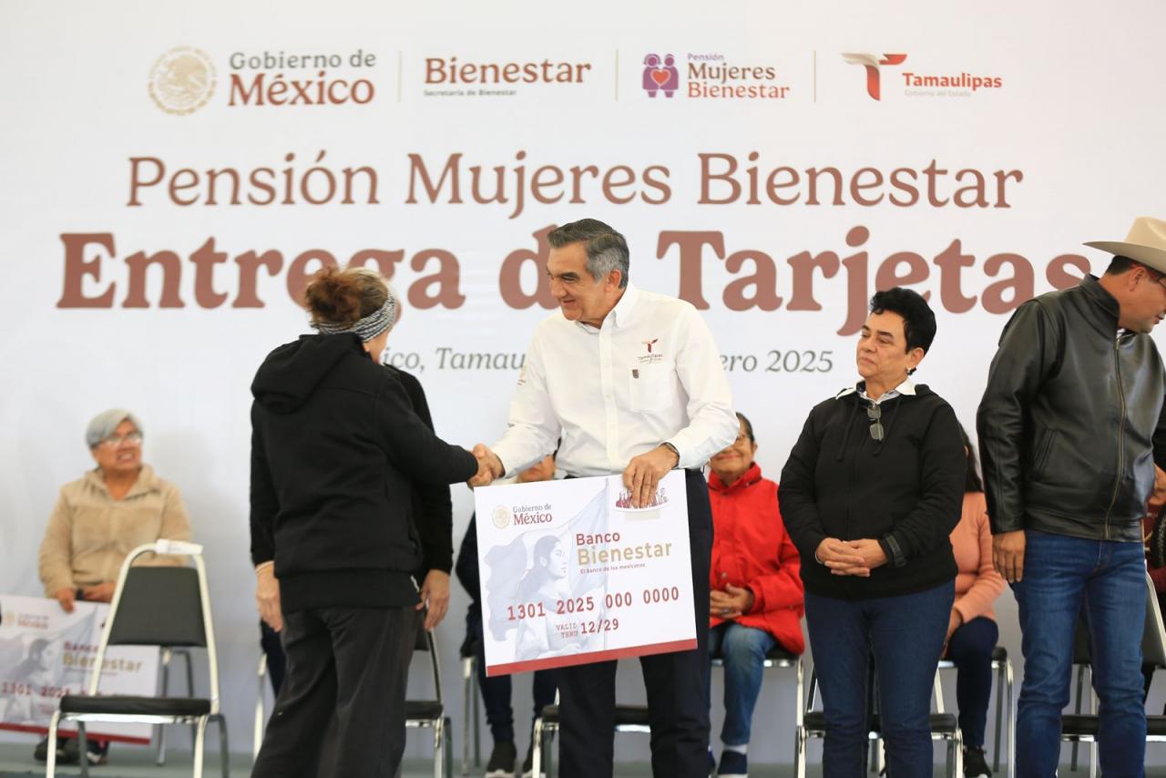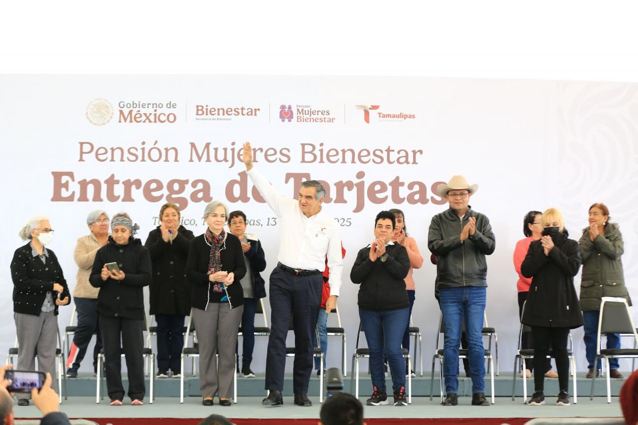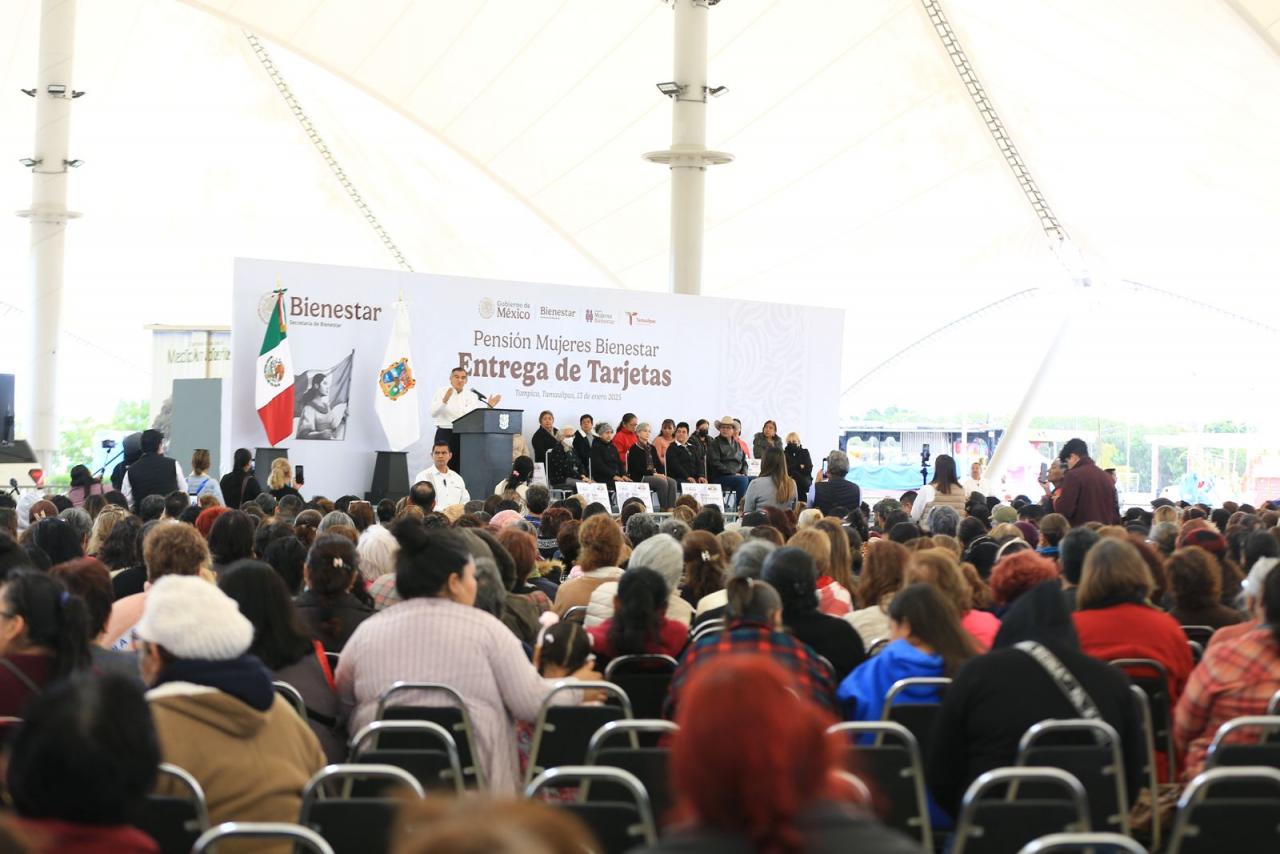 Acompañado por la presidenta del DIF Estatal, doctora María de Villarreal, el gobernador presidió la entrega de la primera remesa de tarjetas 2025 del programa Pensión Mujeres Bienestar, en la velaria de la Expo Tampico, donde destacó que en el presente año Tamaulipas se suma a los tres nuevos programas sociales que impulsa la presidenta de México.