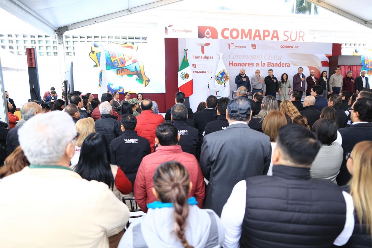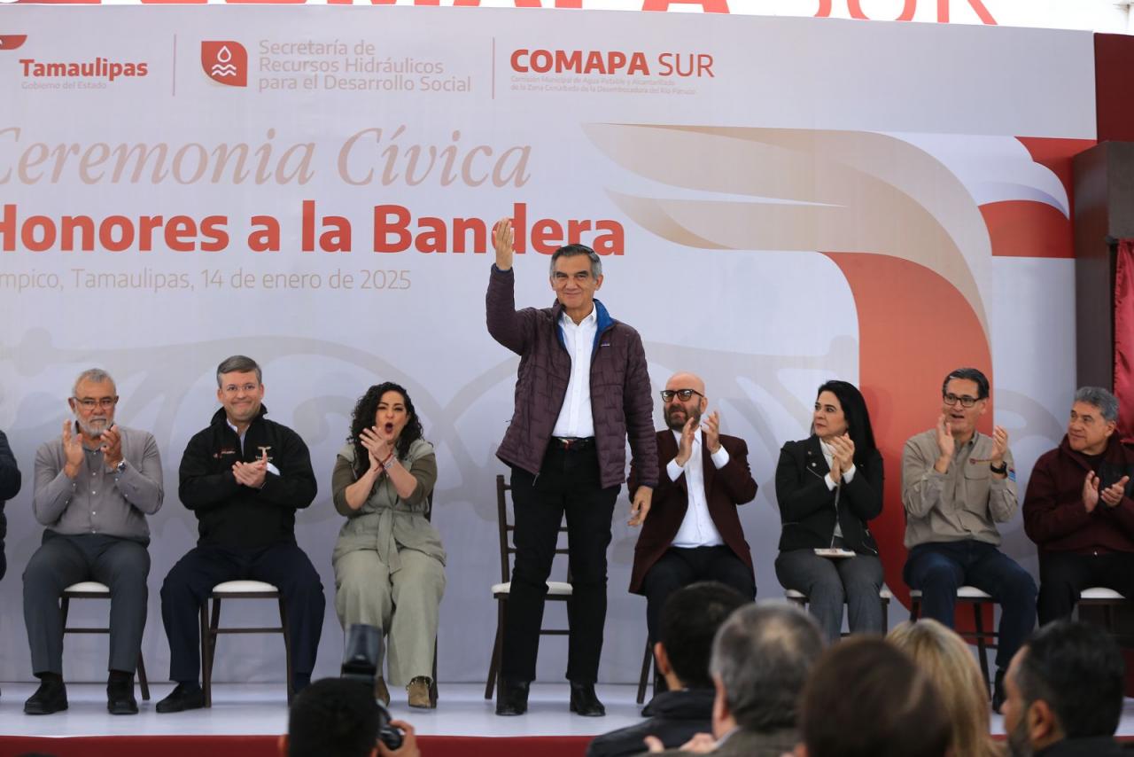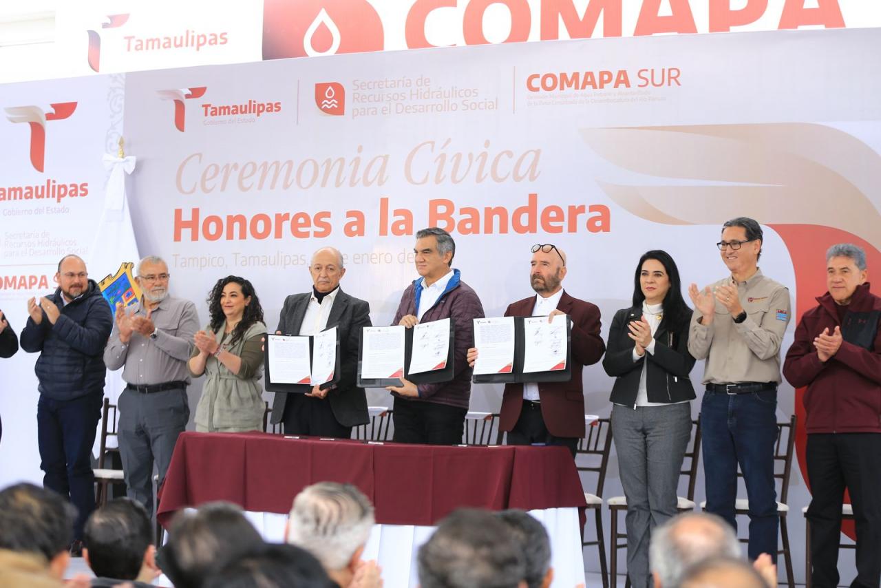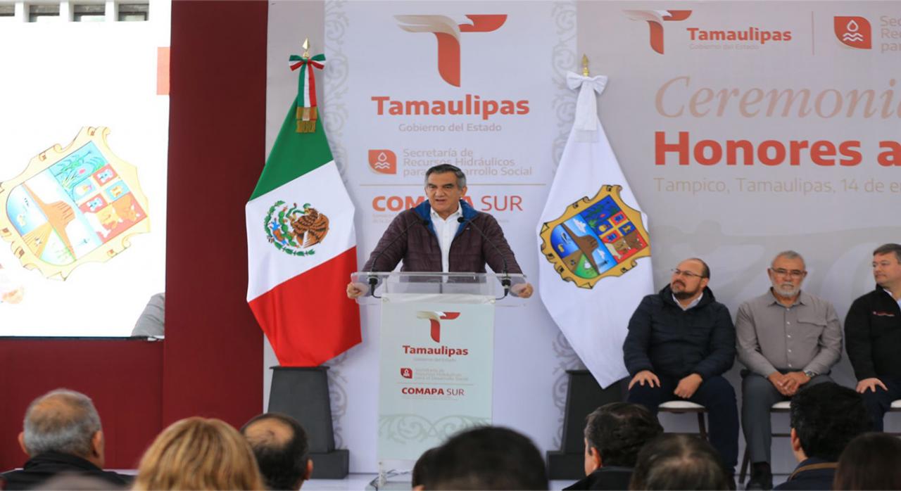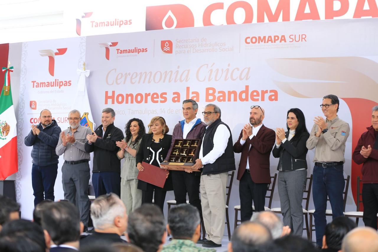 Fue en el marco de la ceremonia cívica de honores celebrada este martes en las instalaciones de la Comapa Sur, donde el gobernador también develó una placa y recibió un reconocimiento del Consejo Ciudadano de Colonos de Tampico, Madero y Altamira por su liderazgo para afrontar y superar la crisis hídrica que se vivió en esta región el año pasado.