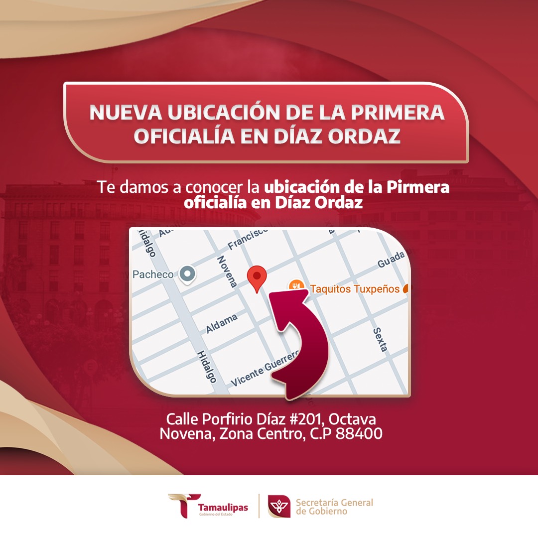 De igual manera, en la Oficialía de Registro Civil de Díaz Ordaz, dijo que la nueva dirección será en Calle Porfirio Díaz #201, Octava Novena, Zona Centro, en Díaz Ordaz.