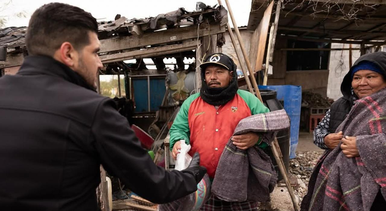 H. Matamoros, Tamaulipas.- El alcalde Alberto Granados Fávila encabezó la entrega de cobijas y kits invernales a cientos de habitantes de la zona pesquera de Higuerillas; con estas acciones se reafirma el compromiso de liderar una administración cercana a los matamorenses, de poco escritorio y más territorio.