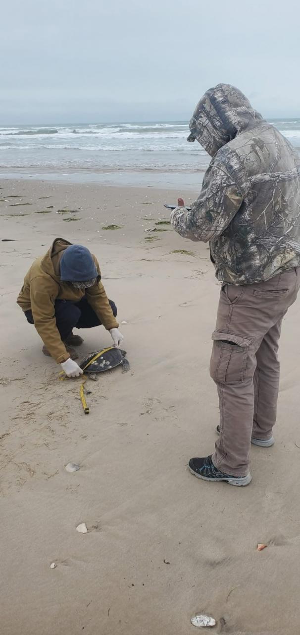 Soto La Marina, Tamaulipas.- Personal de la Comisión de Parques y Biodiversidad de Tamaulipas (CPBT) rescató 40 ejemplares tortuga verde (Chelonia mydas), que estaban varadas por las secuelas de la onda gélida que afecta al estado.