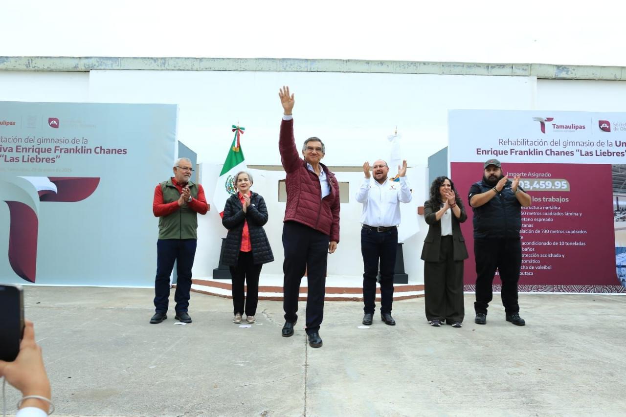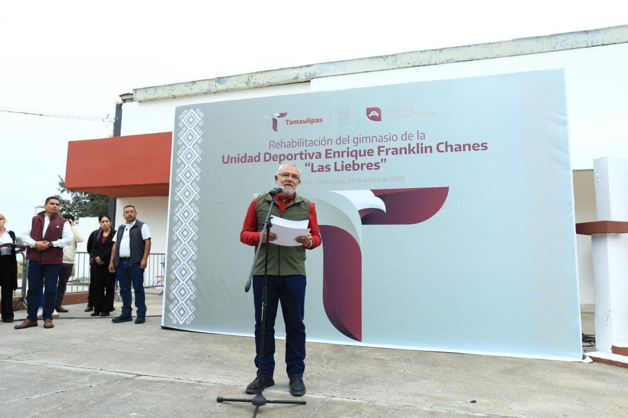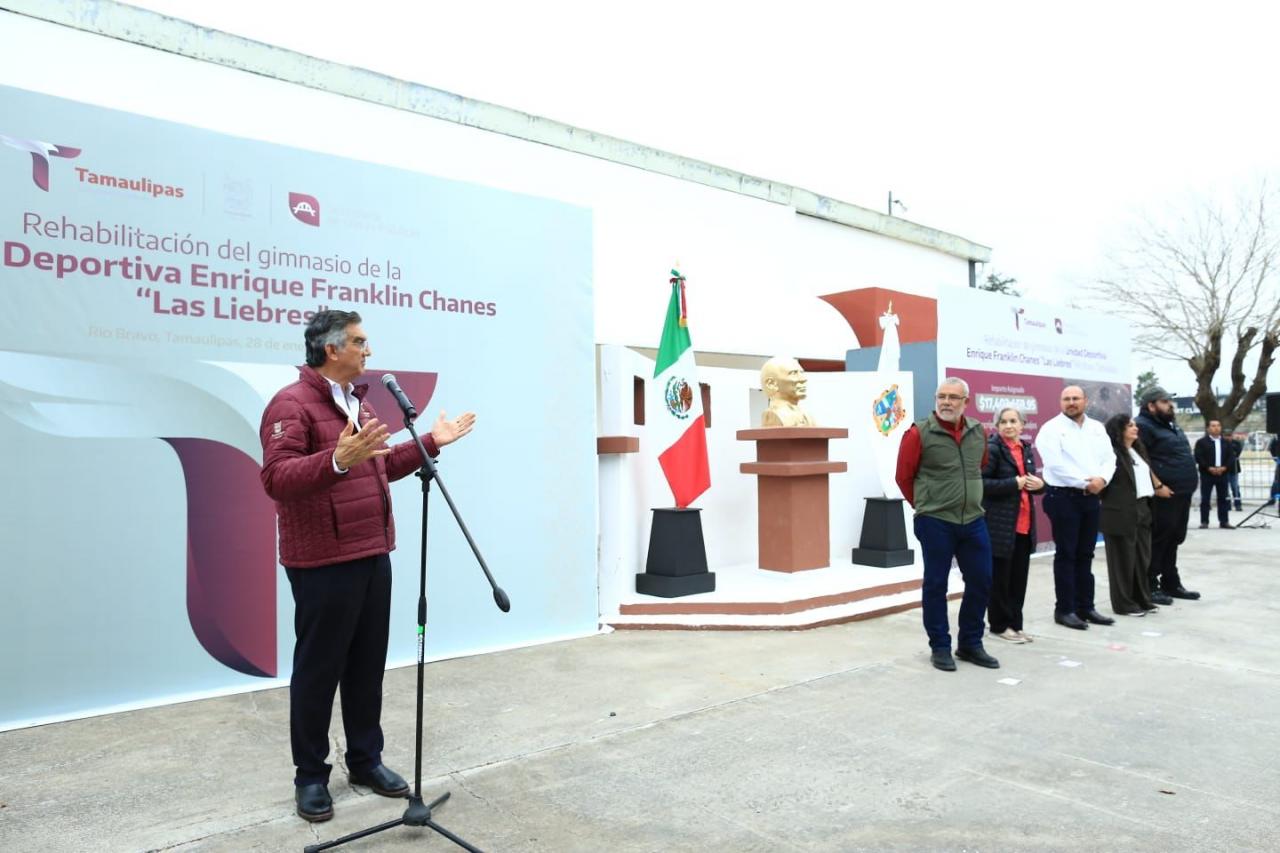Río Bravo, Tamaulipas.- Con una inversión de más de 17 millones de pesos y en respuesta a una petición de la comunidad deportista de Río Bravo, el gobernador Américo Villarreal Anaya entregó esta tarde la obra de rehabilitación del gimnasio de la Unidad Deportiva Enrique Franklin Chanes "Las Liebres". Junto a la doctora María de Villarreal, presidenta del Sistema DIF Tamaulipas, el gobernador aseguró que la entrega de esta obra es un ejemplo del trabajo que realiza el Gobierno del Estado para recuperar la infraestructura deportiva que estuvo abandonada por otras administraciones.