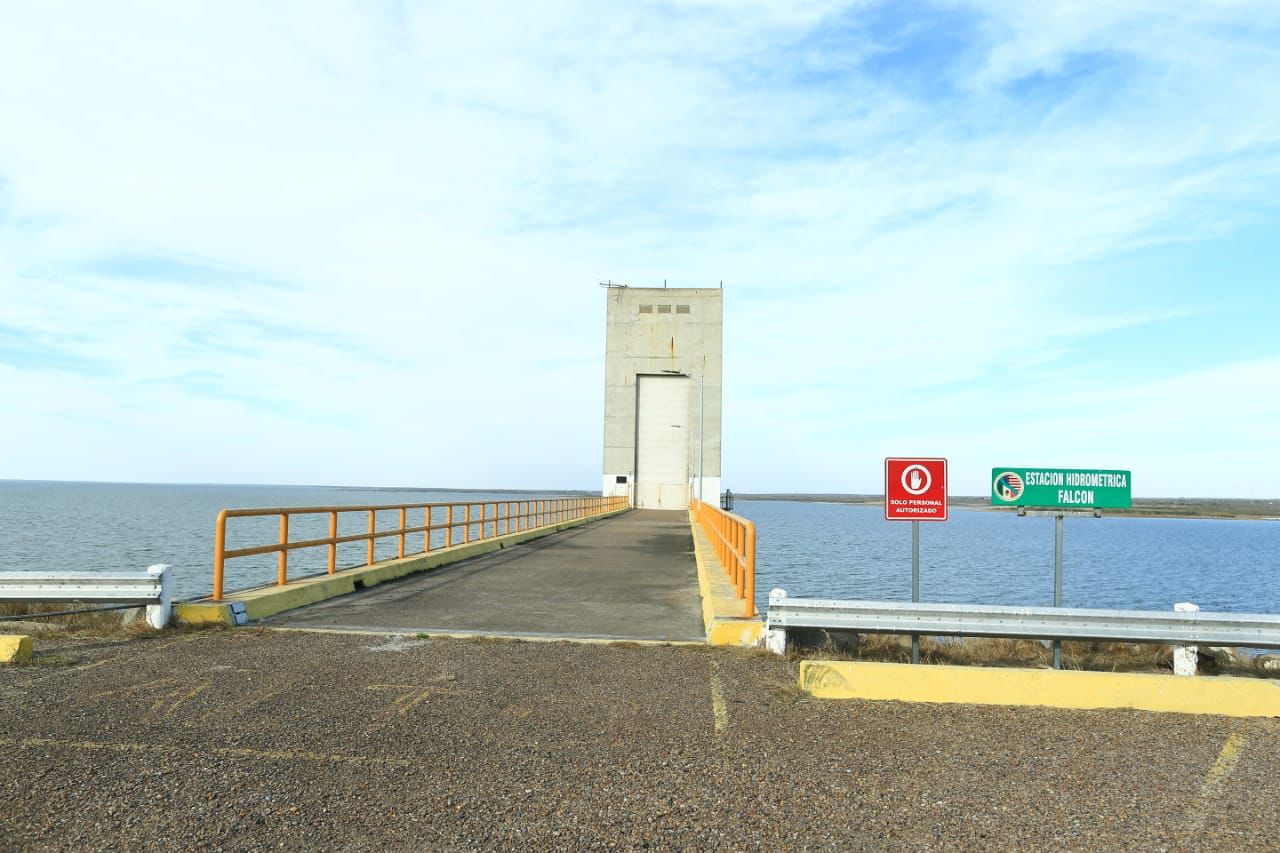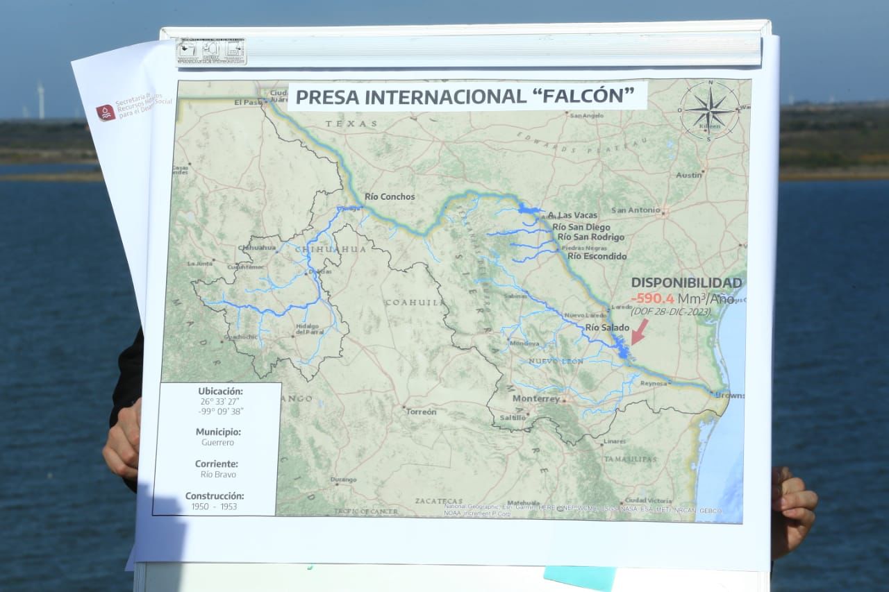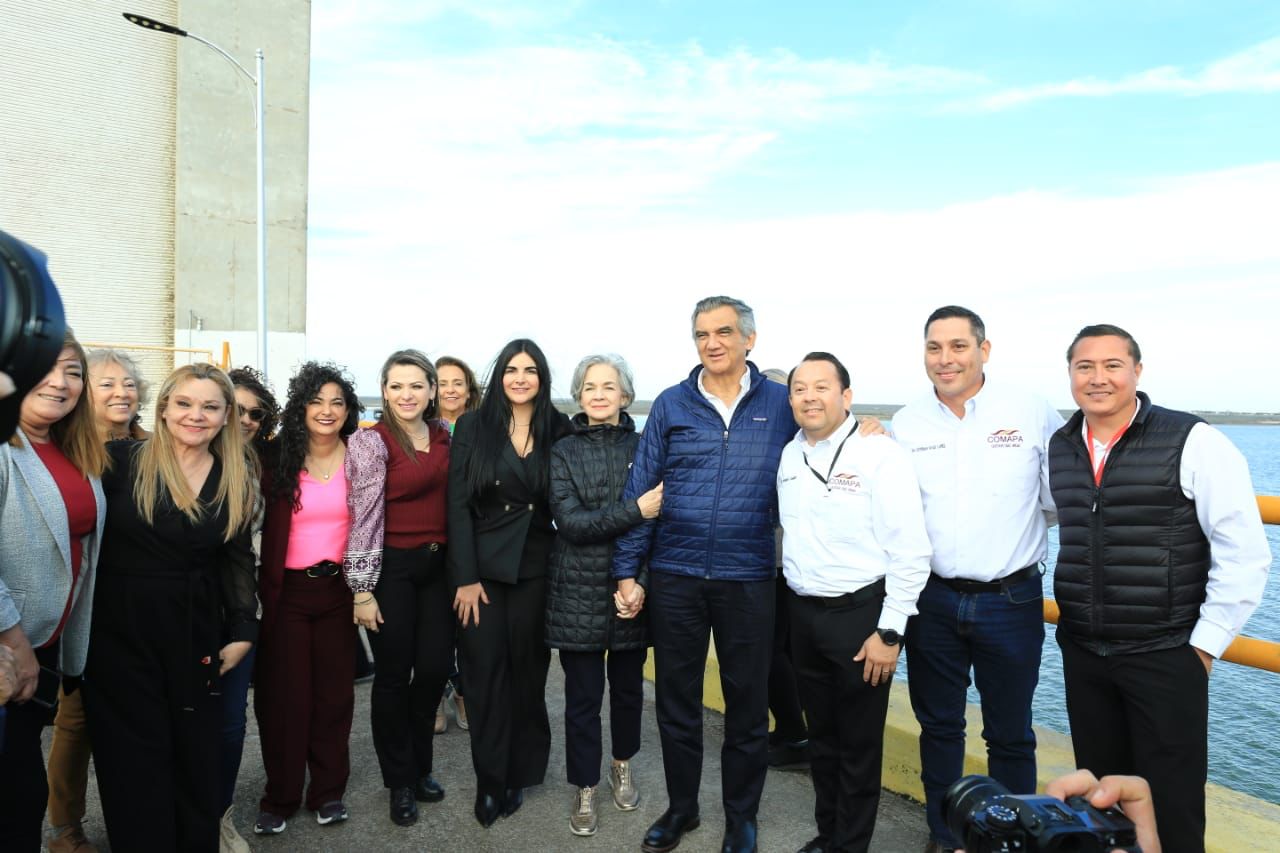 Como parte de su gira de trabajo en la zona ribereña, el gobernador, acompañado por la presidenta del DIF Estatal, doctora María de Villarreal, llegó hasta la estación hidrométrica Falcón, en los límites entre Tamaulipas y Texas, donde constató la crítica situación por los bajos niveles de esta presa internacional.