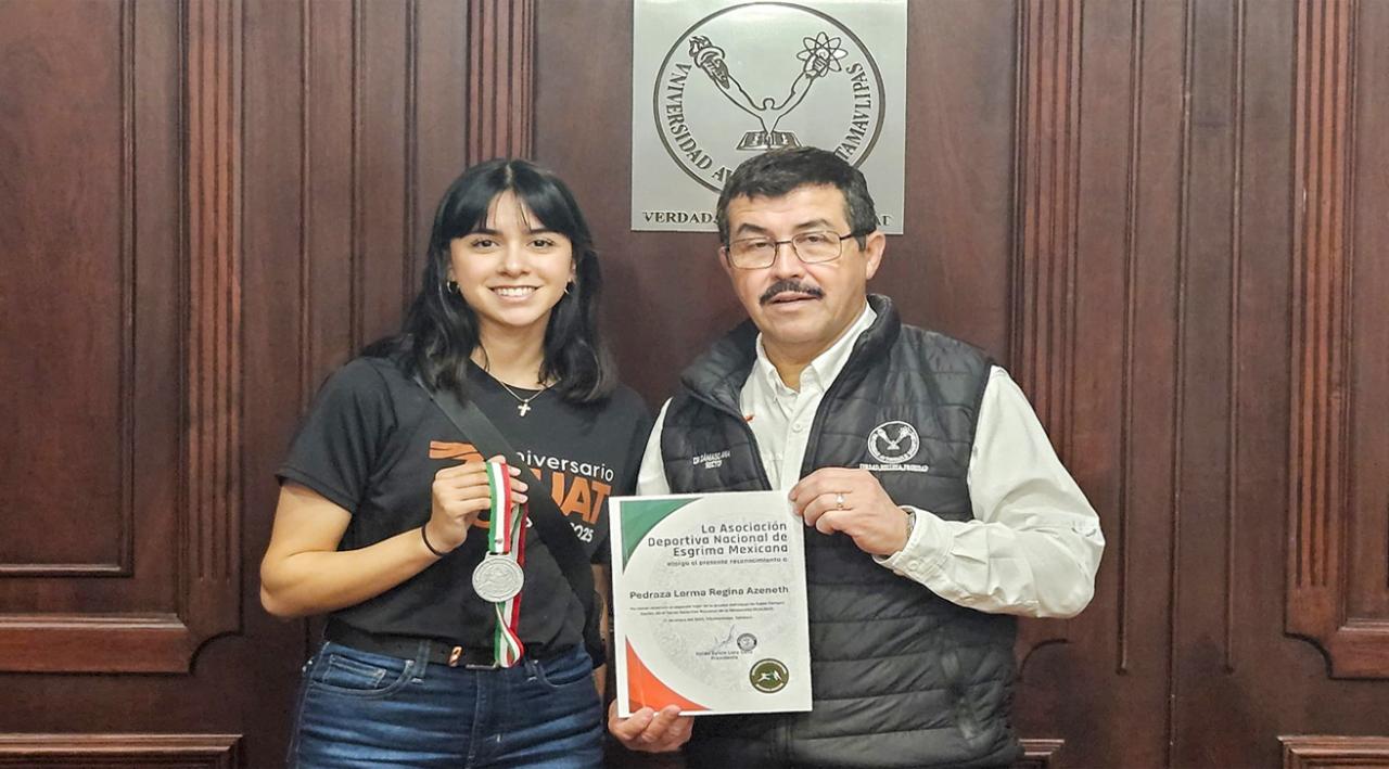 El rector Dámaso Anaya Alvarado felicitó a Regina Pedraza Lerma, esgrimista de la Universidad Autónoma de Tamaulipas (UAT), por lograr la primera posición de la categoría Senior del Ranking de la Asociación Deportiva Nacional de la especialidad.