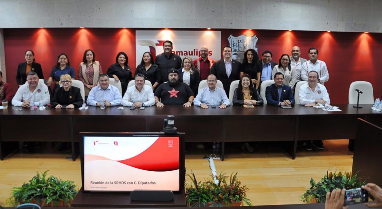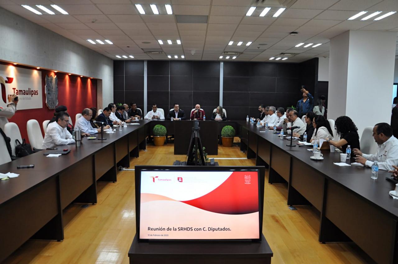 Ciudad Victoria, Tamaulipas.- El secretario de Recursos Hidráulicos para el Desarrollo Social, Raúl Quiroga Álvarez, acompañado por el presidente de la Junta de Gobierno del Congreso del Estado, Humberto Prieto Herrera, y diputadas y diputados locales de la 66ª Legislatura, sostuvo una reunión de trabajo en la que se presentaron los principales proyectos estratégicos implementados por la Secretaría para la transformación del sector hídrico en la entidad.