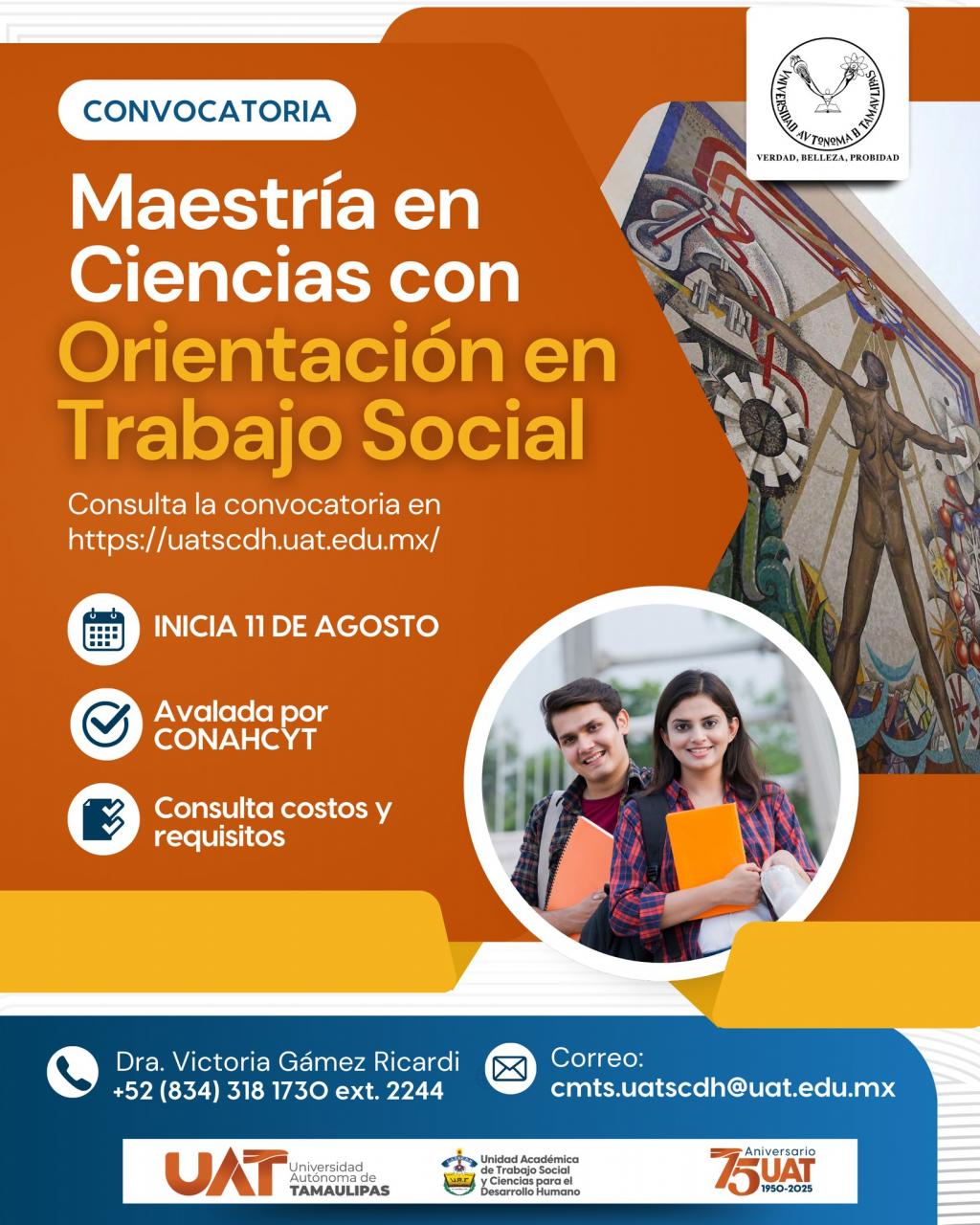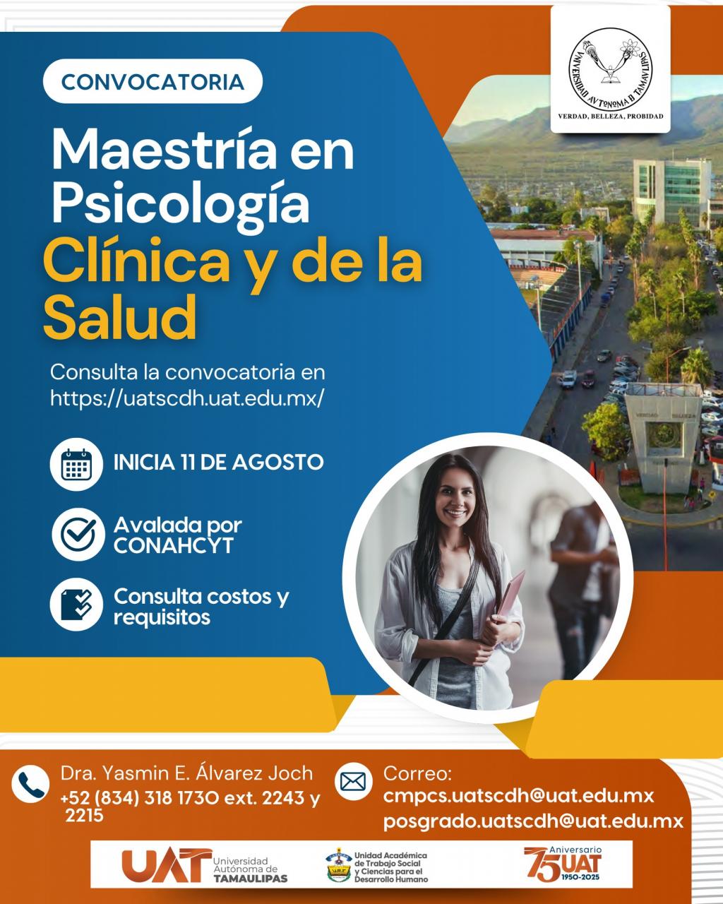 La Universidad Autónoma de Tamaulipas (UAT), invita a los profesionales interesados en continuar con su preparación académica, a cursar los programas de maestría en Psicología Clínica y de la Salud, así como en Ciencias con Orientación en Trabajo Social.