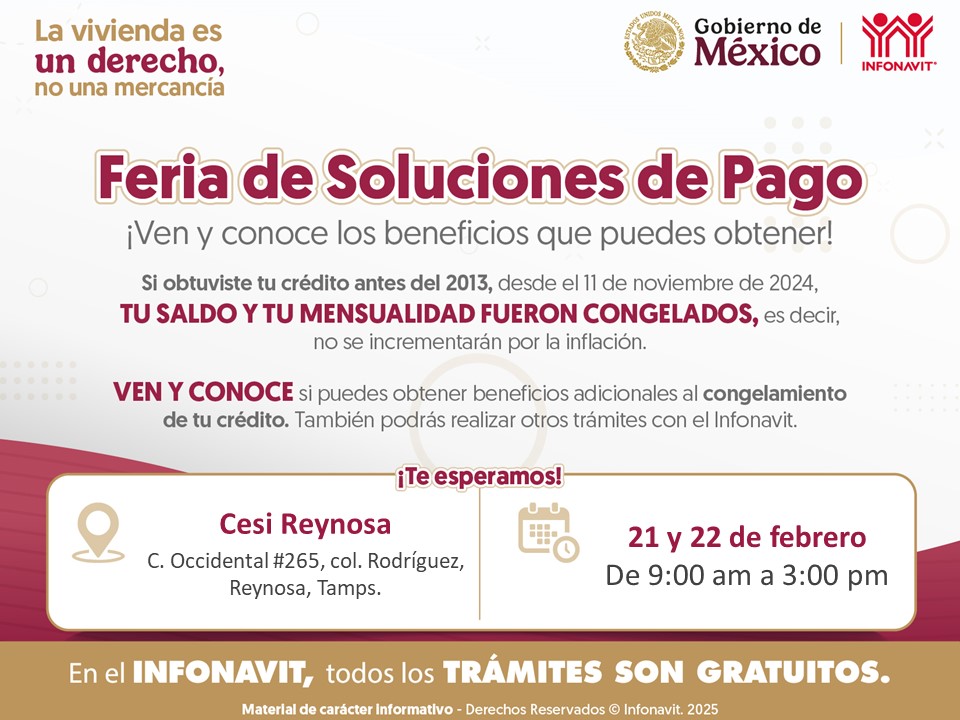 La Feria d Soluciones de Pago del Infonavit, se efectuará este viernes y sábado en horario de la mañana a 3 de la tarde en las oficinas del Centro de Atencion y Servicios de Infonavit en Calle Occidental Numero 265 en la colonia Rodríguez.