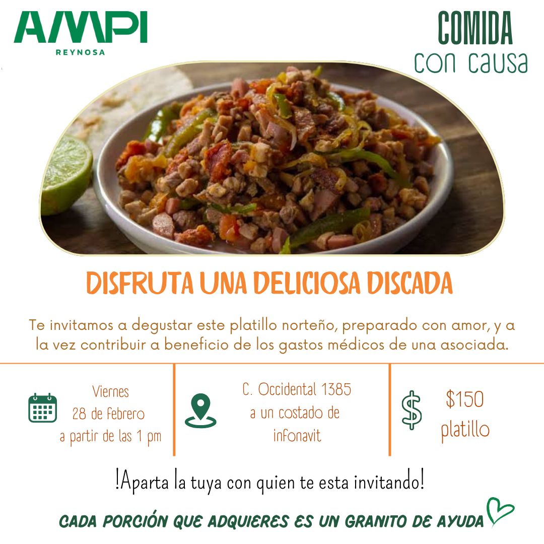 La Asociación Mexicana de Profesionales Inmobiliarios (AMPI) en Reynosa, invitan a la comunidad a participar en un evento con causa, este viernes 28 del presente, consistente en la venta del platillo tradicional norteño “Discada”, cuyos ingresos por concepto de venta se destinarán como apoyo a gastos médicos de una socia.