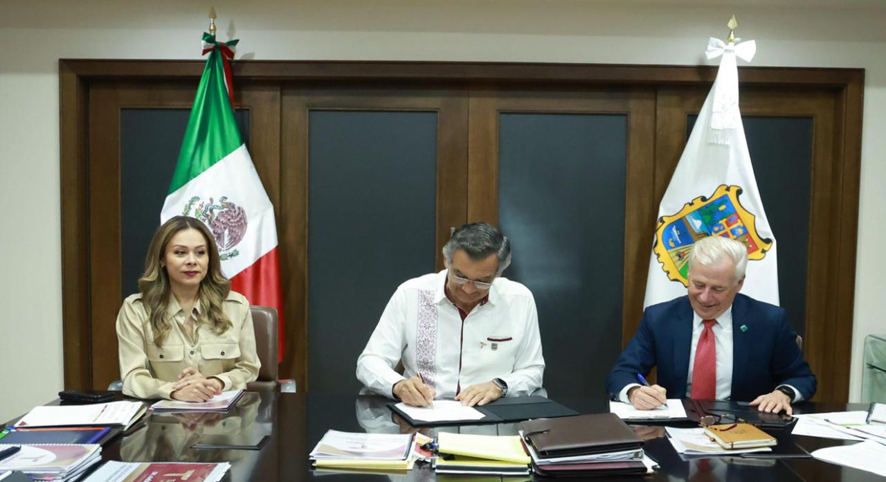 Ciudad Victoria, Tamaulipas.- El gobernador Américo Villarreal Anaya encabezó la firma de un convenio de asistencia técnica con recursos no reembolsables, suscrito por el director general del Banco de Desarrollo de América del Norte (NADBank), John Beckham, y el secretario de Finanzas del Estado, Jesús Lavín Verástegui.