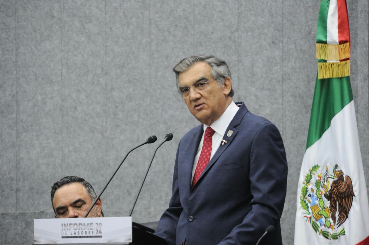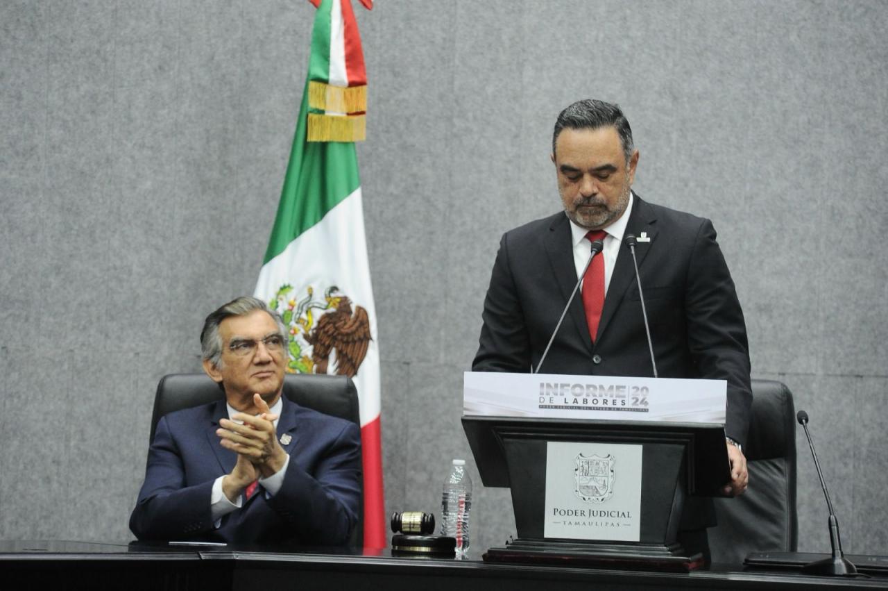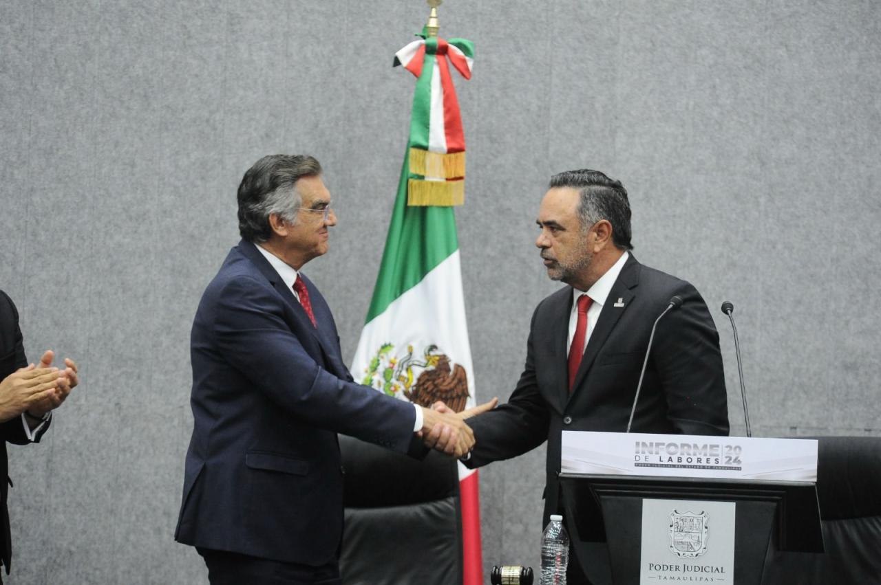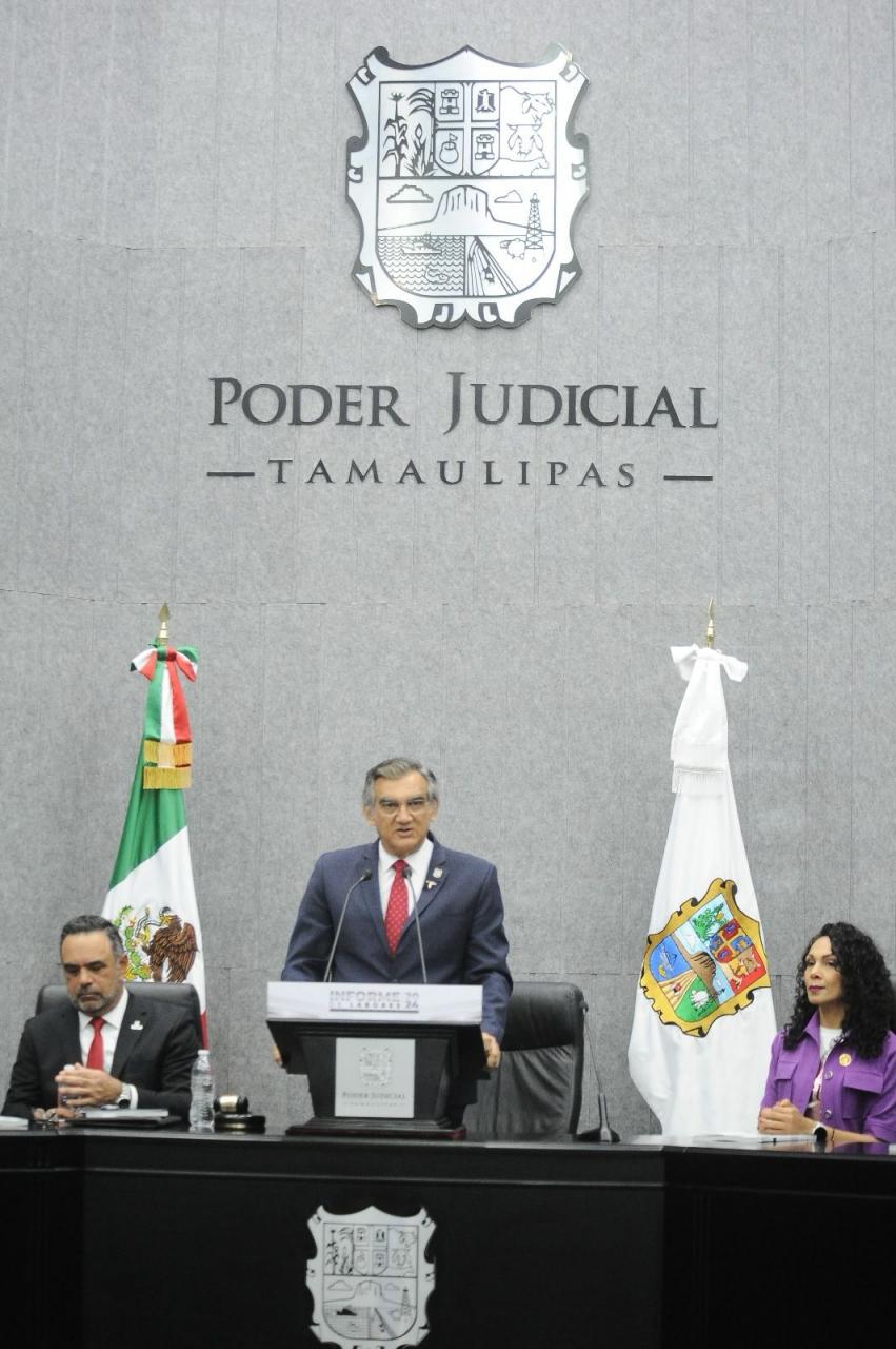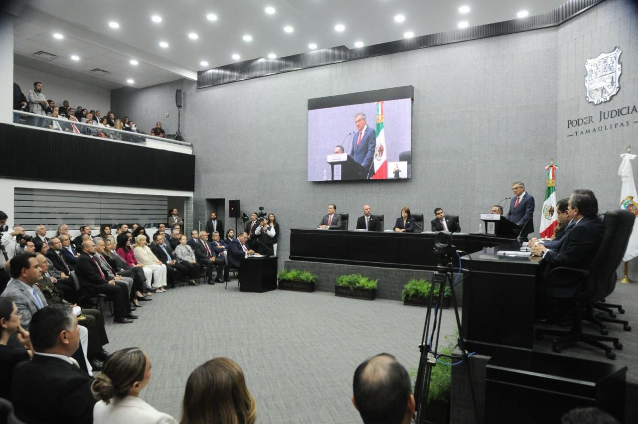 Al asistir a la ceremonia solemne en la que el magistrado presidente del Supremo Tribunal de Justicia y del Consejo de la Judicatura, Hernán De la Garza Tamez, rindió el informe de labores 2024 del Poder Judicial de Tamaulipas, el gobernador exhortó a las y los tamaulipecos a participar y difundir las cualidades positivas y la importancia del carácter histórico de la reforma judicial.