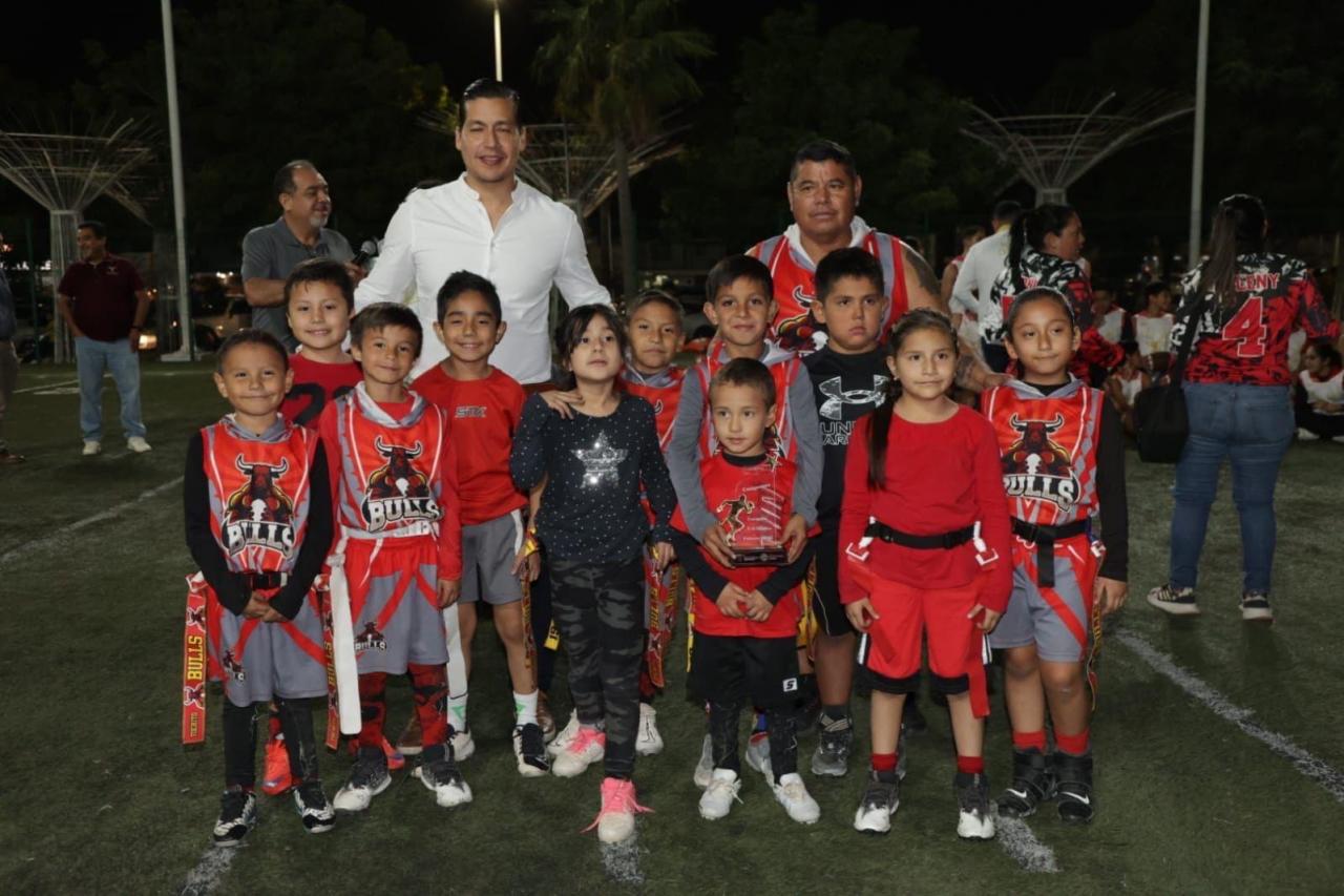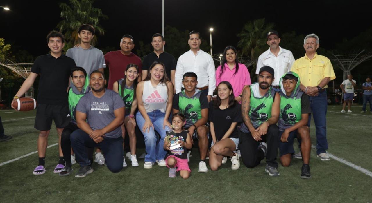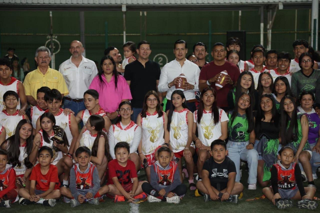 Ciudad Victoria, Tamaulipas.- El director general del Instituto del Deporte, Manuel Virués Lozano, encabezó la ceremonia de premiación a las y los campeones de la primera temporada del torneo de tochito flag, celebrado en Ciudad Victoria.